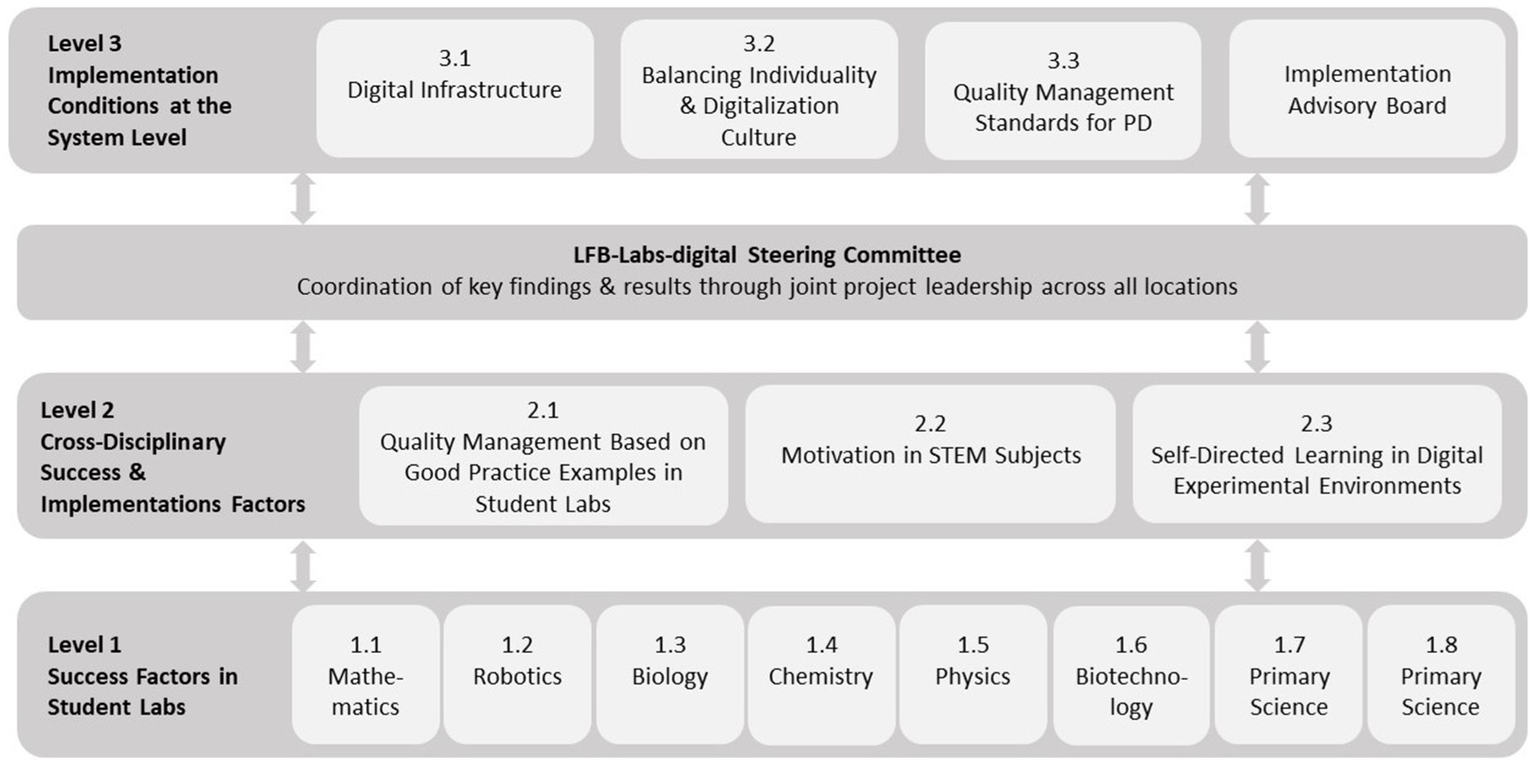 The project structure (Figure 2) shows the subprojects involved and how they are connected within the joint project. Eight STEM student labs are involved in the project, seven of them located in Bielefeld and one in Paderborn, which together form level 1 of the project and offer teacher PD in iterative cycles. The designs of all individual PD programs and the other sub-projects are summarized in Kirchhoff et al. (2024b) and have also been partially presented in individual publications (e.g., Brusdeilins et al., 2024; Kiel and Schwedler, 2023; Lehmenkühler et al., 2024; Ziegler and Stinken-Rösner, 2024).