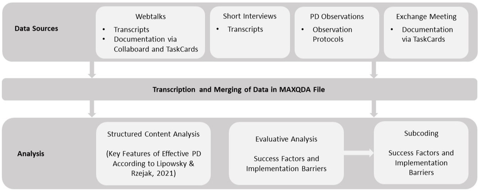 Transcripts of the interviews and webtalks, as well as the observation protocols, were coded using the same category system to highlight similarities and differences between the facilitators’ perceived perspective and the external perspective on the PD sessions.