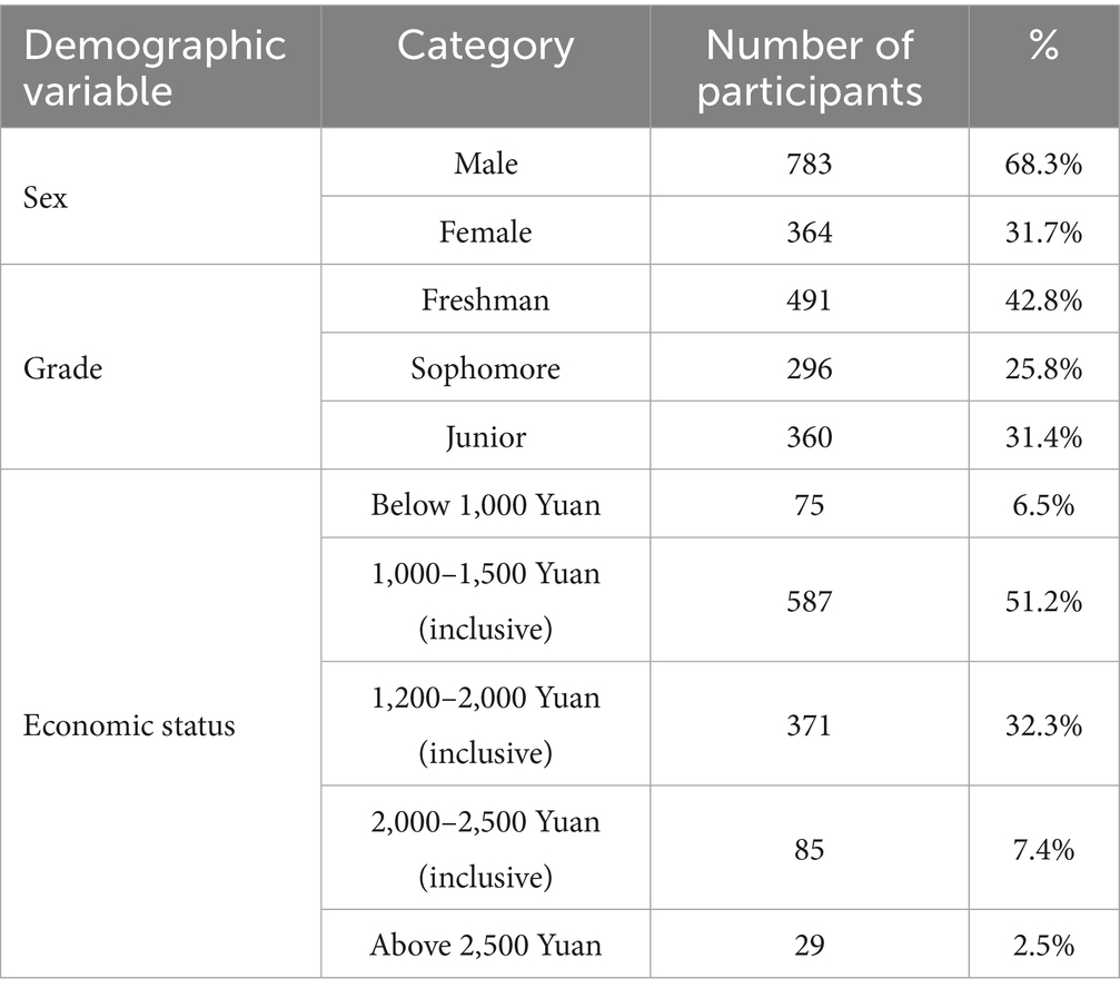 The research was carried out at University H in China, with a predominant representation of male participants (68.3%), while freshmen made up 42.8% of the sample. More than half of the university students (51.2%) reported economic status (monthly living expenses) ranging from 1,000 to 1,500 Yuan, indicating a relatively modest standard of living (Considering the local economic context, a monthly budget of 1,000–1,500 Yuan can only cover students’ basic food expenses). As living expenses surpass 1,500 Yuan, university students begin to have progressively more disposable money (see Table 1).