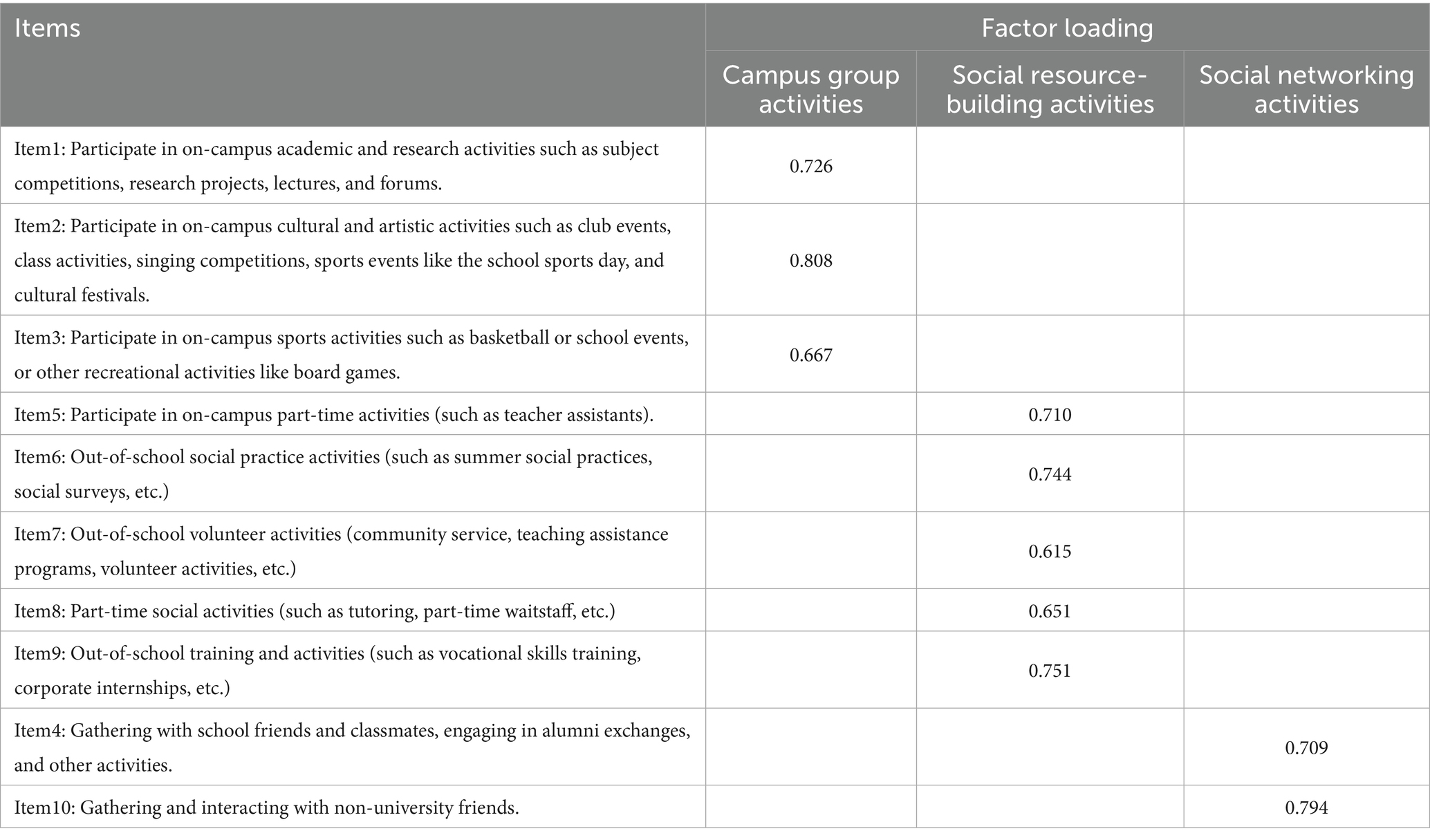 The Kaiser-Meyer-Olkin (KMO) test and Bartlett’s test of sphericity were employed to analyze the questionnaire data. The KMO value was 0.825, and Bartlett’s test indicated significance (p < 0.001), confirming the suitability of the data for factor analysis. Through factor analysis, the social participation of university students was categorized into three dimensions, reflecting their level of engagement in various activities within the preceding 3 months. Based on the outcomes of the factor analysis and considering the actual context of university students’ social participation, three dimensions were identified: campus group activities, social resource-building activities, and social networking activities. Campus group activities (e.g., “Participate in on-campus cultural and artistic activities such as club events, class activities, singing competitions, sports events like the school sports day, and cultural festivals.”), which center on collaboration and communication, emphasize the frequency of interaction with others during collective activities. Social resource-building activities [e.g., “Part-time social activities (such as tutoring, part-time waitstaff, etc.)”], which focus on accumulating social resources, emphasize the frequency of utilitarian and reciprocal interactions with others. Social networking activities (e.g., “Gathering with school friends and classmates, engaging in alumni exchanges, and other activities.”), which center around emotional communication, emphasize the frequency of emotional interactions with others.