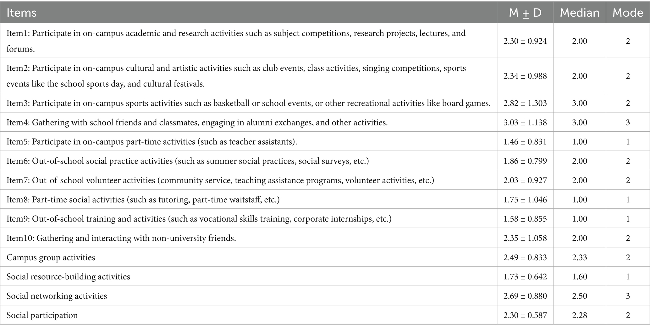 Table 3 presented Overview of university students’ social participation. In the dimension of social participation, university students had the highest frequency in participating in social networking activities, followed by campus group activities, and the lowest in social resource-building activities. Taking a monthly cycle as the unit, the frequency of social participation for most students was between “less than once a month” and “once a month” (2.3 ± 0.587), suggesting a relatively low frequency of social participation.