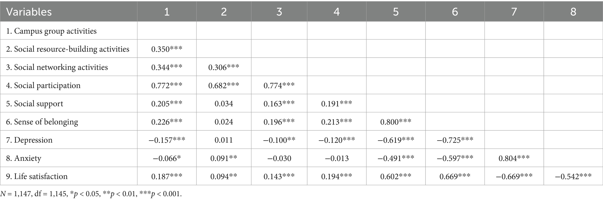 Campus group activities, social resource-building activities, social networking activities and social participation were significantly positively correlated with life satisfaction [r(1145) = 0.187, p < 0.001; r(1145) = 0.094, p = 0.01; r(1145) = 0.143, p < 0.001; r(1145) = 0.194, p < 0.001]. Campus group activities were significantly negatively correlated with depression [r(1145) = −0.157, p < 0.001] and anxiety [r(1145) = 0.066, p = 0.026]. Social networking activities and social participation were significantly negatively correlated with depression [r(1145) = −0.100, p = 0.01; r(1145) = −0.12, p < 0.001]. Notably, social resource-building activities were significantly positively correlated with anxiety [r(1145) = 0.091, p = 0.002] (see Table 6).