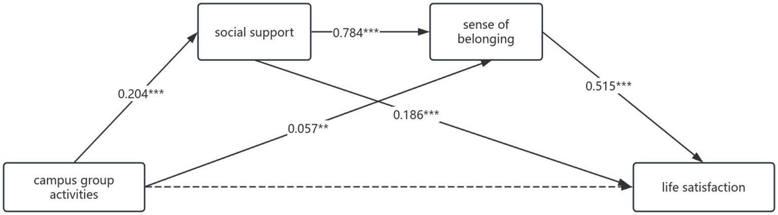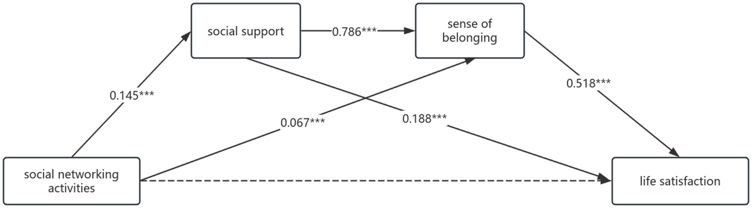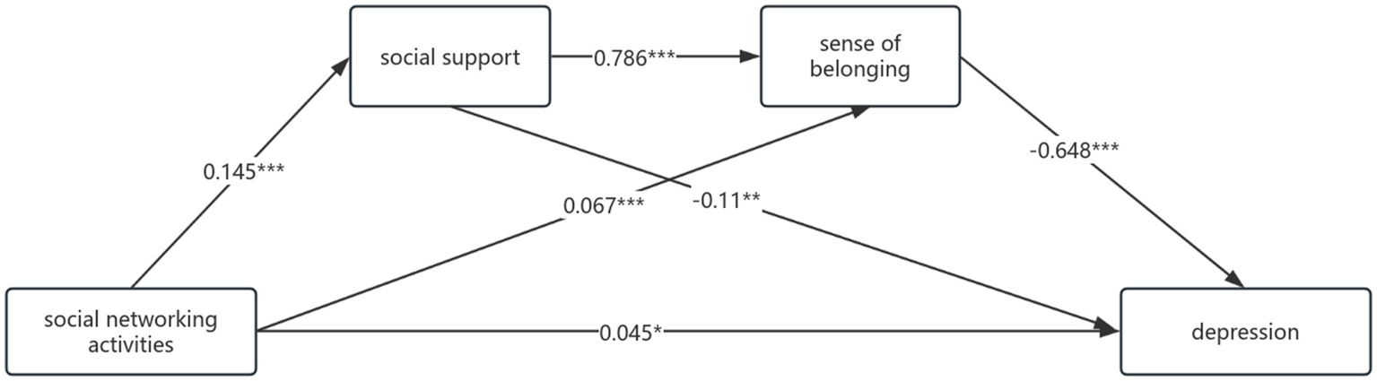 Research question 3: As core factors in social integration, how do social support and sense of belonging influence the relationship between social participation and university students’ mental health?