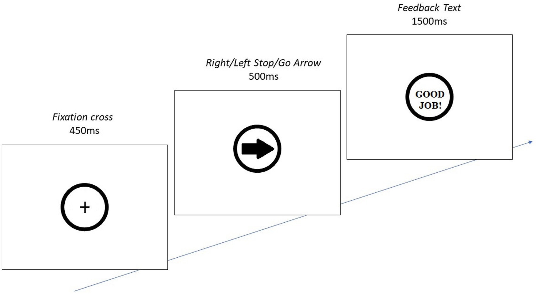 Diagram of a three-step visual task sequence: First, a fixation cross displayed for four hundred fifty milliseconds. Next, a rightward arrow shown for five hundred milliseconds. Finally, feedback text saying