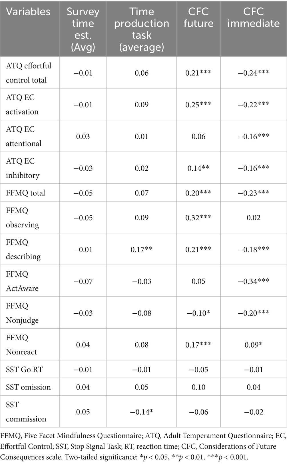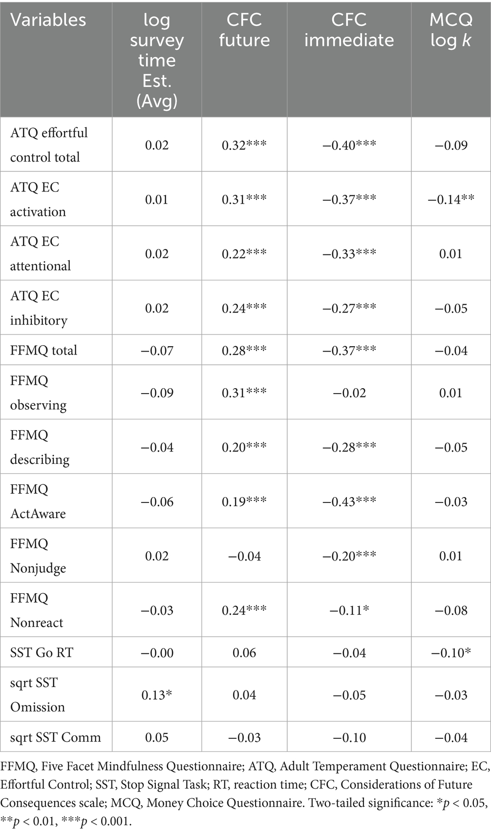 Accounting for control variables did not significantly alter these relations. However, for the subsample of participants who completed the E-Prime portion of the study (n = 287; Supplementary Table 16), there were additional significant partial correlations between MMI and overestimating survey duration (r = 0.13, p = 0.026), and multitasking during the survey with CFC future (r = −0.14, p = 0.022) and immediate-focused (r = 0.13, p = 0.034) subscales, as well as a weak relation between these two subscales (r = −0.12, p = 0.046).
