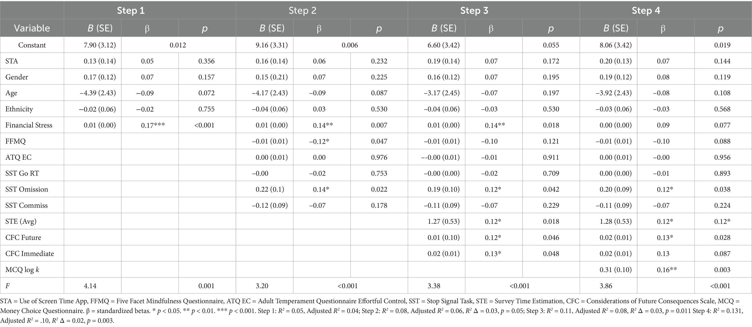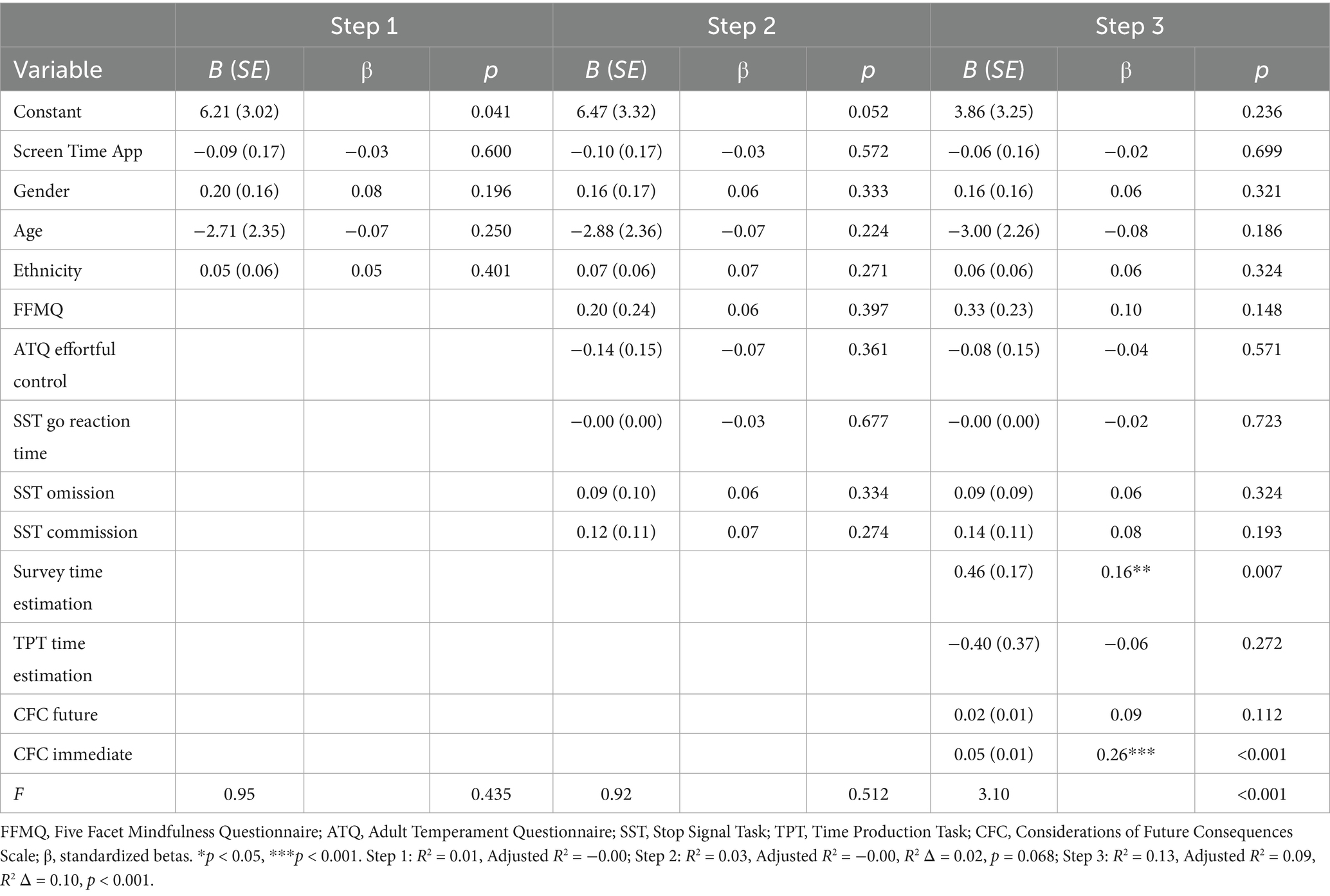 Multiple regression analyses were conducted to determine the contribution of the sets of independent variables (i.e., demographics and control variables at step 1, cognitive control variables at step 2, and time perspective variables at step 3) to the variance in media multitasking. Two blockwise regressions were conducted: one which included both survey-derived and E-Prime task measures (Table 3) and one which included only survey measures (Supplementary Table 17).