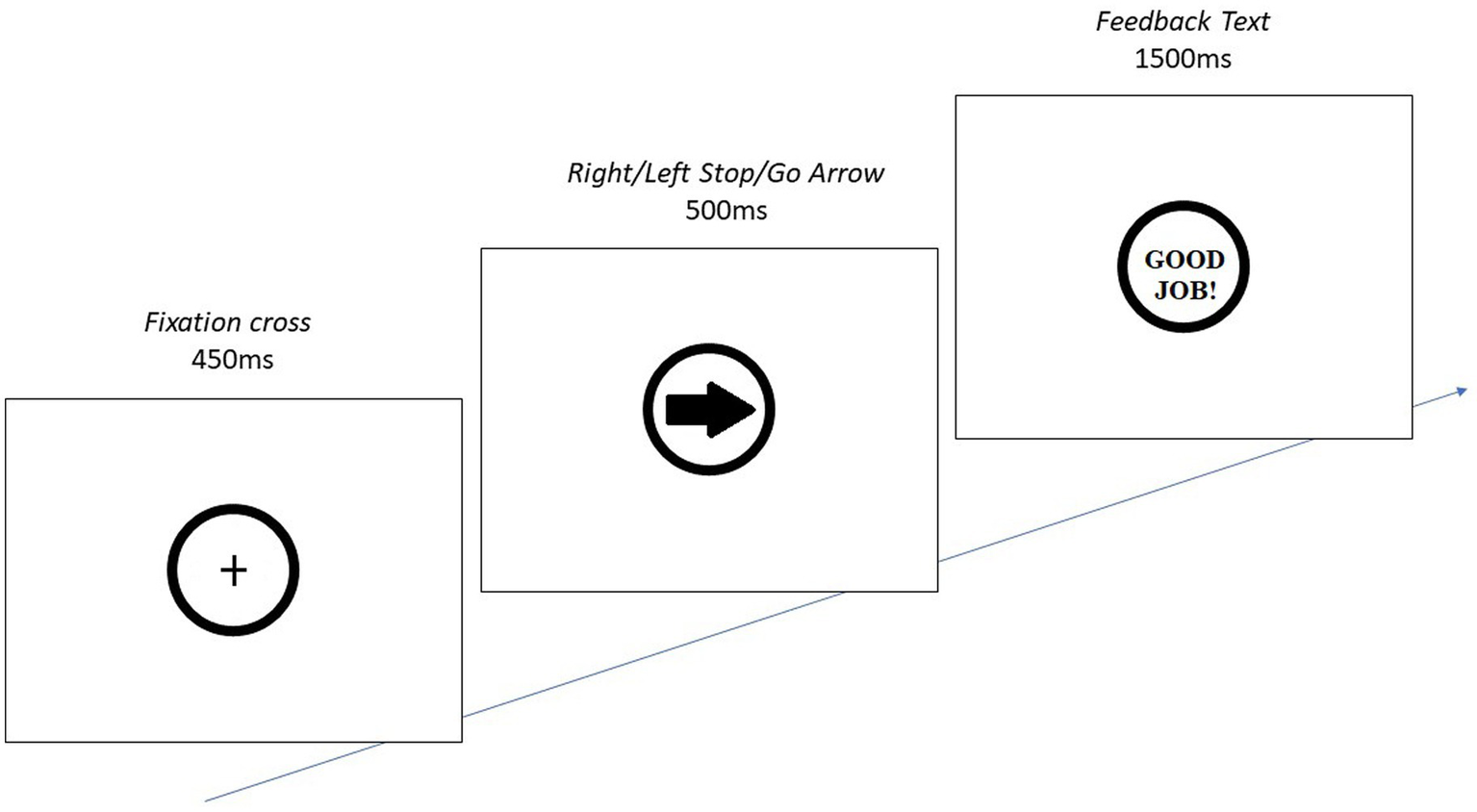 *The stimulus presented is either a right-facing go-arrow (shown), left-facing go-arrow, or right- or left-facing stop-arrow (red ring around arrow instead of black). Participants must press the right [left] arrow on the keyboard when a right [left] arrow is shown, and press nothing when a stop-arrow is shown. The fixation cross indicates where the arrow will appear. **The feedback text either reads “Good Job!” (shown) if participant correctly did not respond on a stop-arrow or pressed the correct key on either go-arrow, “Incorrect!” if participant pressed incorrect key on go-arrow (e.g., right key for left arrow), “Too Slow!” if participant did not respond in 500 ms or less on a go-arrow, or “Do not Respond!” if participant responded on a stop-arrow.