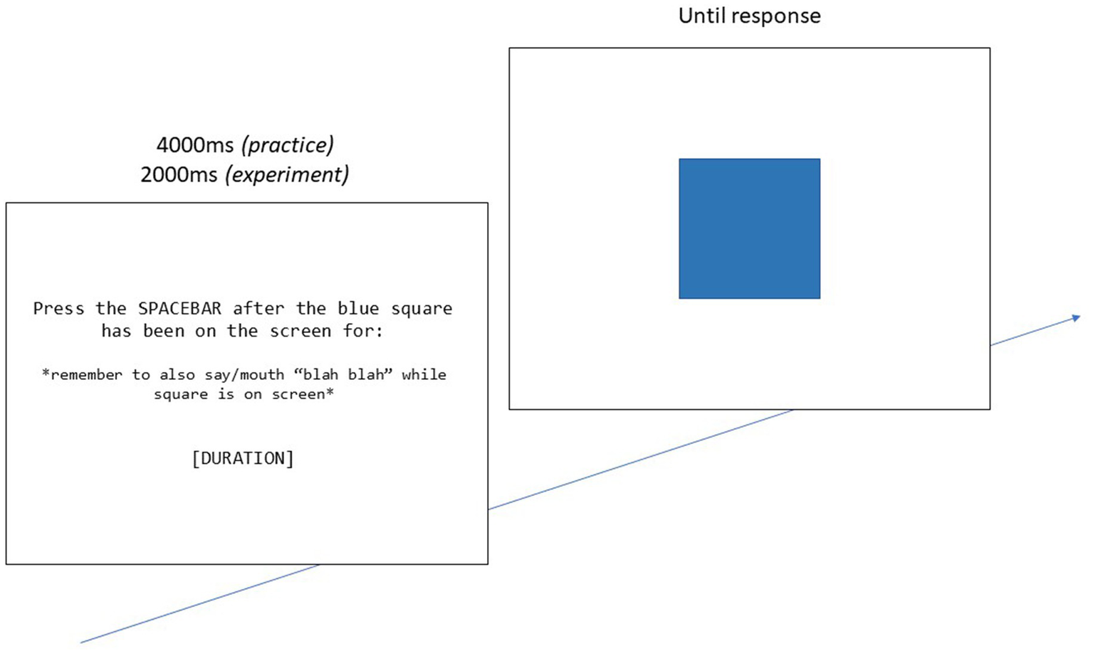 The time production paradigm (TPT) (Vanneste et al., 2016) used in this experiment utilized prospective time estimation and was used to measure one’s internal clock speed. The task began with a brief practice phase that was not included in final analyses. Participants were instructed to memorize the target duration of time (e.g., “5 s”) that appeared in the center of the screen. Then, a blue square would appear in the center of the screen and participants were asked to press the spacebar when they estimated the target duration to be over. They were also asked to engage articulatory suppression and prevent the use of counting strategies, as suggested by Vanneste et al. (2016). The procedure is illustrated in Figure 2.