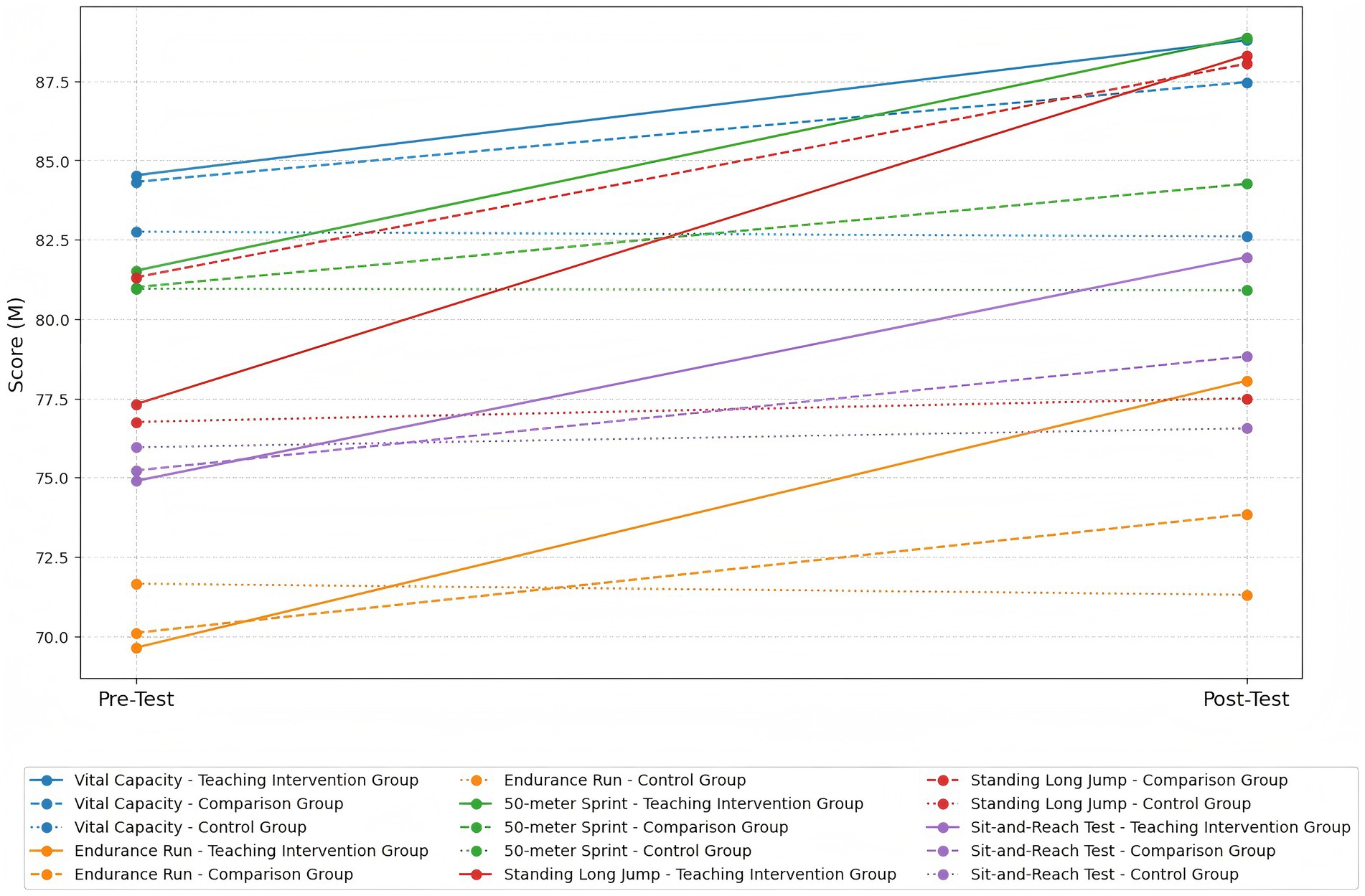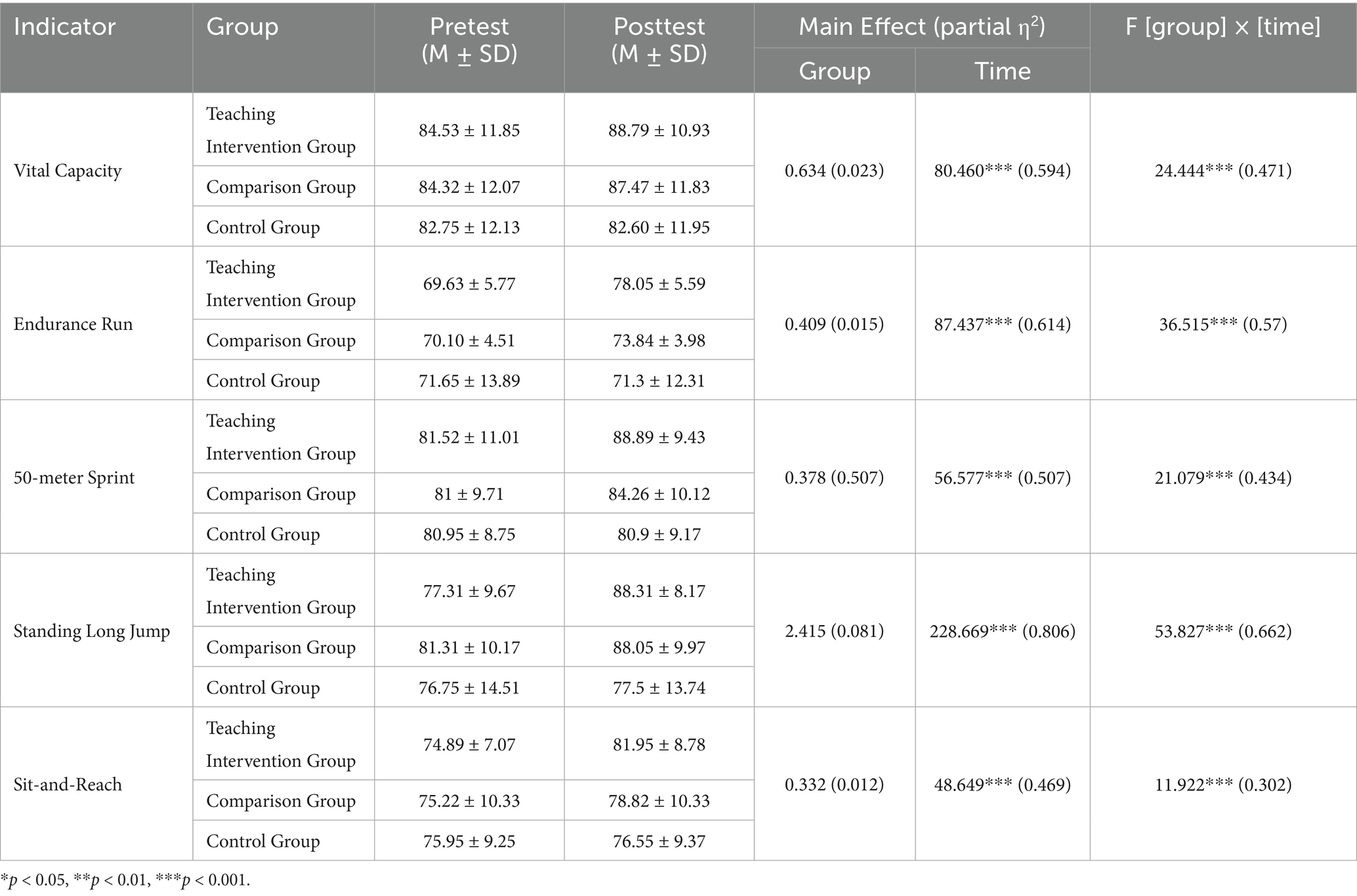Results from the repeated measures ANOVA revealed highly significant main effects of time across all physical fitness indicators (ps < 0.001), indicating that overall improvements occurred following the instructional interventions. The main effects of group were not significant for Vital Capacity, Endurance Run, 50-meter Sprint, Standing Long Jump, and Sit-and-Reach Test (ps > 0.05), suggesting no overall group differences. However, all indicators showed highly significant group × time interaction effects (ps < 0.001), indicating that the intervention effects varied among the different instructional groups.