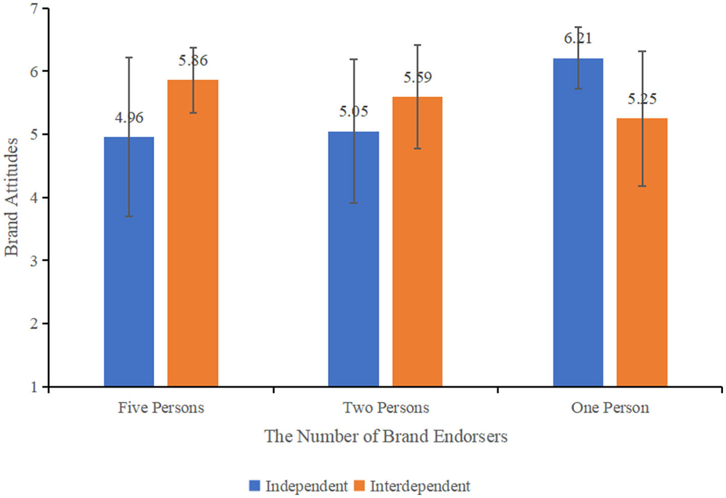“In the single (one-person A) endorsement group, consumers with independent self-construal (M independent= 5.84, SD = 0.58) had higher brand attitudes compared to those with interdependent self-construal (M interdependent= 5.01, SD = 0.95, F (1,74) = 20.456, p < 0.001, = 0.217).”