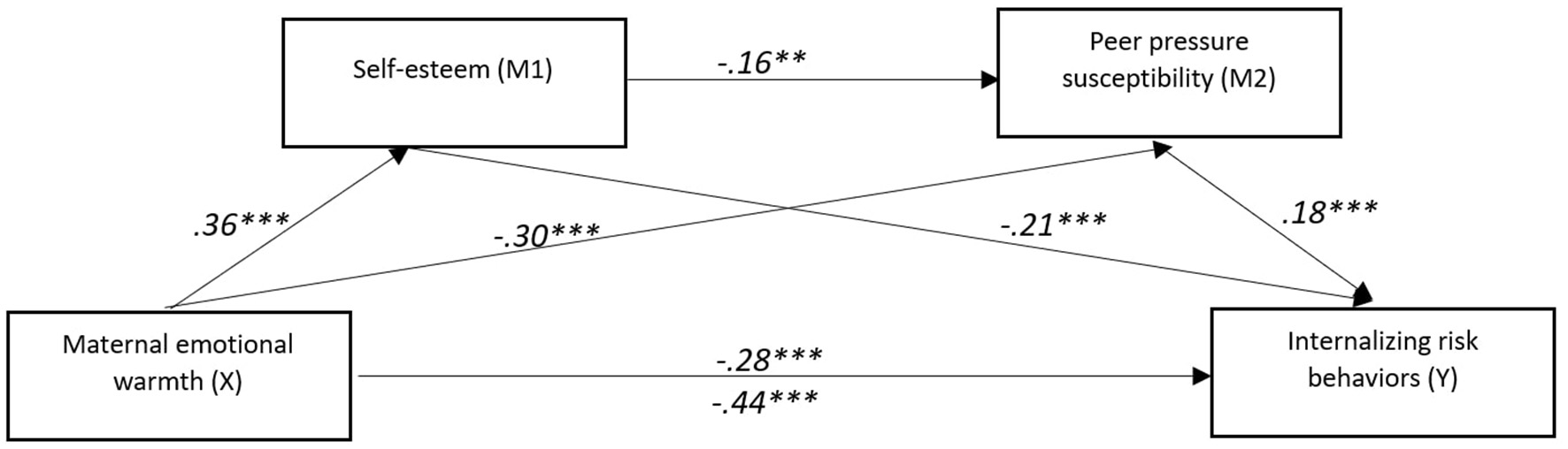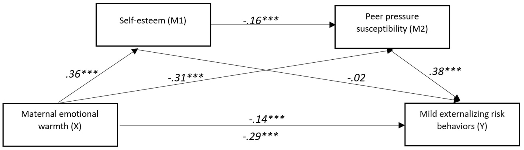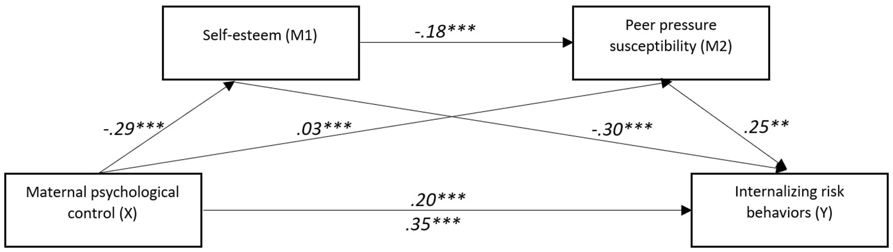 Preliminary independent samples t-tests were conducted to examine potential gender differences in the study variables. The results showed that girls scored significantly higher than boys on internalizing risk behaviors, t(365) = −5.34, p < 0.05, while no significant gender differences were found for mild externalizing risk behaviors. Given the observed gender differences in one of the outcome variables, as well as prior research indicating that gender may influence both internalizing and externalizing problems, gender was included as a control variable in all subsequent analyses to ensure a more accurate estimation of the hypothesized effects. After controlling for participants' gender, the results showed that maternal psychological control (β = 0.33, p < 0.001) had a positive impact on mild externalizing risk behaviors. After accounting for mediators, the direct effect was reduced (β = 0.19, p < 0.001), indicating that although part of the relation can be explained by self-esteem and peer pressure susceptibility as mediators, some part of the relation remains unexplained. Maternal psychological control significantly and negatively predicted self-esteem (β = −0.29, p < 0.001), indicating that higher levels of maternal psychological control are associated with lower self-esteem.