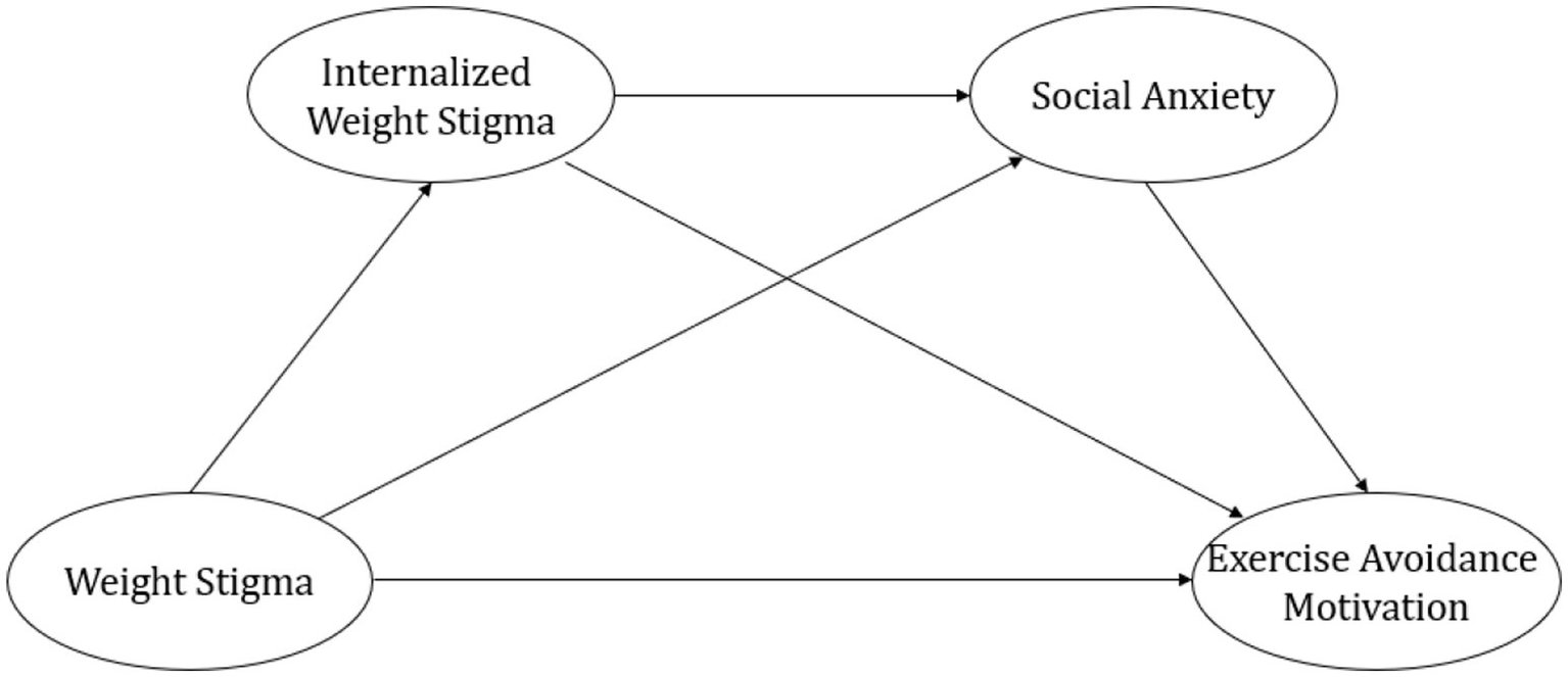 Weight stigma, defined as “society’s devaluation and vilification of individuals with excess weight” (Tomiyama, 2014), has been consistently linked to psychological distress and maladaptive health behaviors. Exercise avoidance motivation denotes an individual’s tendency to actively avoid exercise (More et al., 2019). Research has demonstrated that experiences of weight stigma are associated with diminished exercise participation and lower motivation for physical activity, particularly among individuals with higher body weight (Schvey et al., 2017; Vartanian, 2015; Vartanian and Novak, 2011; Vartanian and Shaprow, 2008). A systematic review found that both weight stigma and internalized weight stigma are closely associated with a decrease in physical activity levels. This relationship is often not a direct effect but rather an indirect influence mediated through a series of psychological and behavioral mechanisms that impact individuals’ participation in physical activity (Pearl et al., 2021). Furthermore, the research showed that internalized weight stigma partially mediated the relationship between weight stigma and exercise behavior (Bidstrup et al., 2022). Similarly, individuals with pronounced internalized weight stigma not only exhibit an intensified fear of negative evaluation by others but also endorse weight-related stereotypes, such as the belief that ‘higher-weight individuals have less willpower and are less deserving of a fulfilling social life.’ This self-stigmatization fosters feelings of diminished self-worth, increased self-consciousness, and perceived incompetence, which in turn may contribute to greater vulnerability to depression, anxiety, body dissatisfaction, and disordered eating behaviors (Emmer et al., 2020; Hilbert et al., 2014; Schvey et al., 2017). These psychological burdens can further reinforce avoidance of physical activity, creating a cycle of distress and inactivity. While prior studies have established a link between weight stigma and exercise avoidance motivation (Ajibewa et al., 2024; Bevan et al., 2021; Han et al., 2018), the precise psychological mechanisms underlying this relationship remain insufficiently understood. Given the profound implications for mental health and physical well-being, further research is warranted to elucidate the internalization process of weight stigma and its specific pathways influencing exercise avoidance motivation. This is particularly relevant for college students, among whom experiences of weight stigma may discourage participation in sports and physical activity (Ajibewa et al., 2024). Understanding these mechanisms has important implications for developing interventions and strategies to promote student engagement in physical activity.