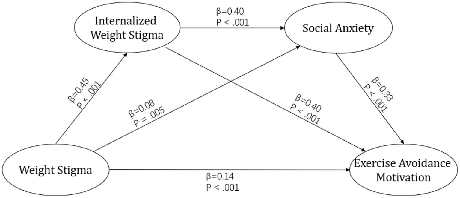 Results: Correlational analyses suggested a partial mediation model, in which weight stigma contributed to exercise avoidance motivation both directly and indirectly via internalized weight stigma and social anxiety. Specifically, higher weight stigma was linked to greater internalized weight stigma (β = 0.45, p < 0.001), which, in turn, was associated with increased social anxiety (β = 0.40, p < 0.001), ultimately leading to heightened motivation to avoid exercise (β = 0.33, p < 0.001).