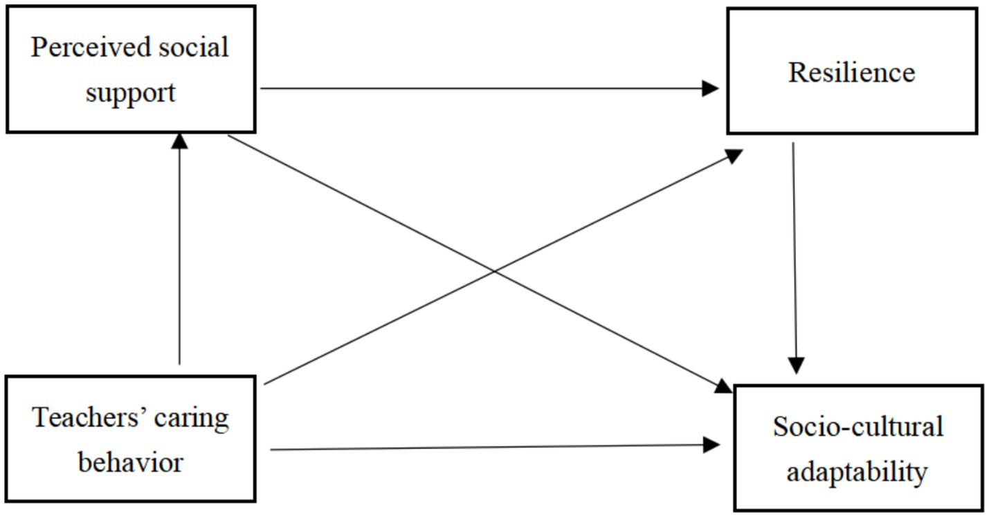 This study investigates the relationships among socio-cultural adaptability (SCA), perceived social support (PSS), resilience (RS), and teachers’ caring behavior (TCB) experienced by international students studying in China. The findings validate several hypotheses through the construction of a chain mediation model that explores how TCB influences SCA in the context of online teaching, as well as the mediating roles of PSS and RS.