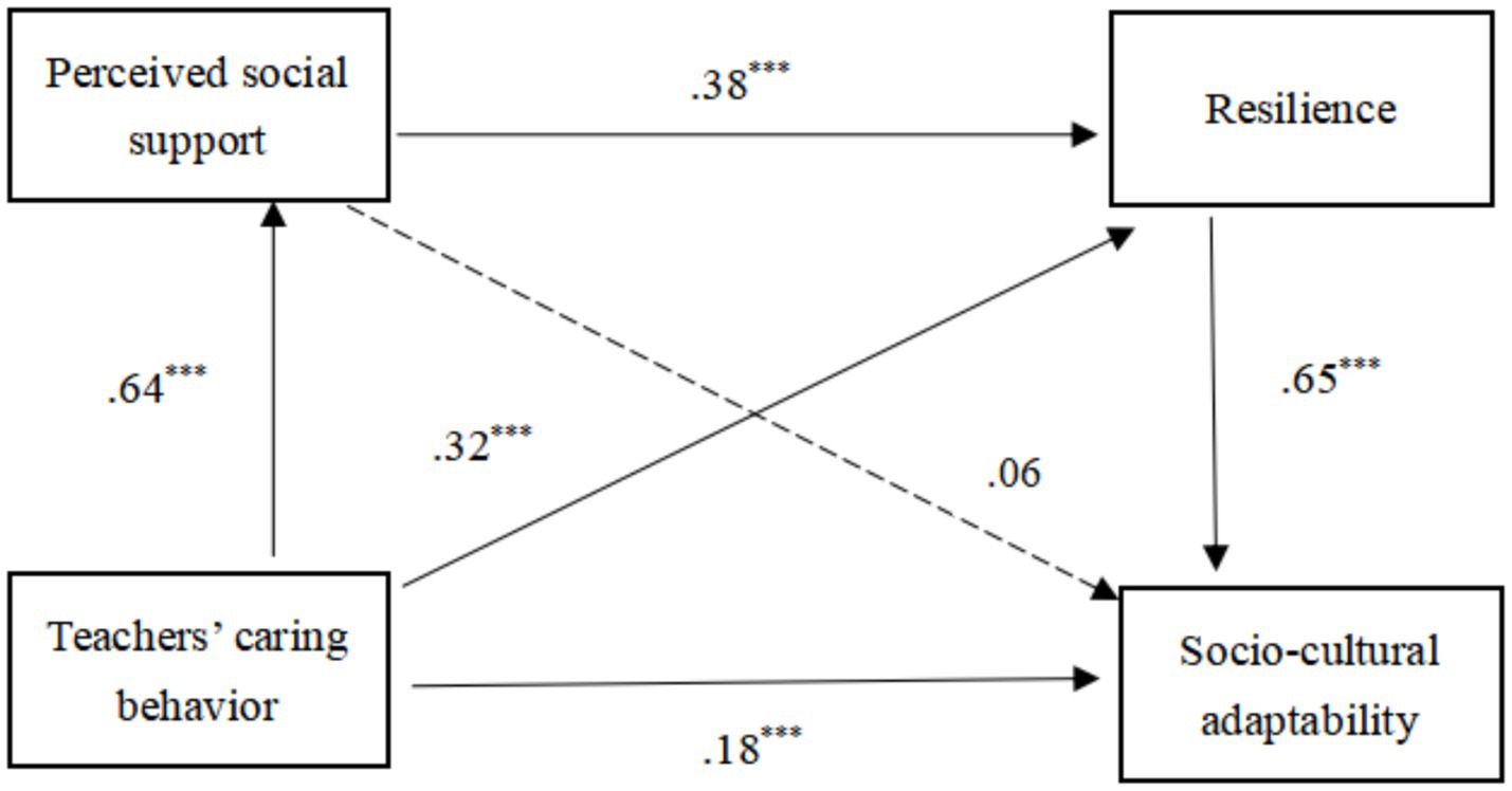 The non-significant mediating effect of perceived social support (PSSS) in the relationship between teacher caring behavior (TCB) and socio-cultural adaptability (SCA) warrants further discussion. One possible explanation lies in cultural variation in how international students recognize or respond to perceived support. In some collectivist cultures, social support may be interpreted as implicit or indirect and not always consciously acknowledged. Furthermore, the widespread use of online and hybrid learning models during the pandemic may have reduced opportunities for students to engage in direct support-seeking behaviors from peers or teachers. These contextual and cultural factors may have weakened the role of perceived support as a psychological bridge between TCB and SCA.