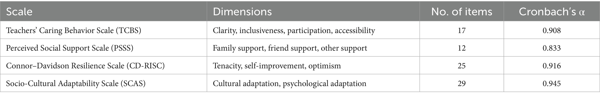 Li et al. (2021) developed the teachers’ caring behavior scale (TCBS) in Online Teaching on the basis of the previous scale; the Cronbach’s alpha of the entire scale is 0.952. The 17-item scale is composed of four parts: clarity (0.880), inclusiveness (0.902), participation (0.883) and accessibility (0.890). Some items of the scale include “Encourage and allow students to share different opinions or experiences from the teacher” and “Provide rich elective content online to facilitate students to expand on their own.” Participants gave their answers on a 5-point Likert scale ranging from 1 (not applicable to me) to 5 (very applicable to me). In the present study, the retest Cronbach’s alpha is 0.908, and the 4-factor load coefficients are 0.768, 0.853, 0.812, and 0.844, indicating that the scale is suitable for international students studying in China and also suitable for TCB in online and offline mixed teaching. Wu et al. (2024) validated the reliability of this scale.