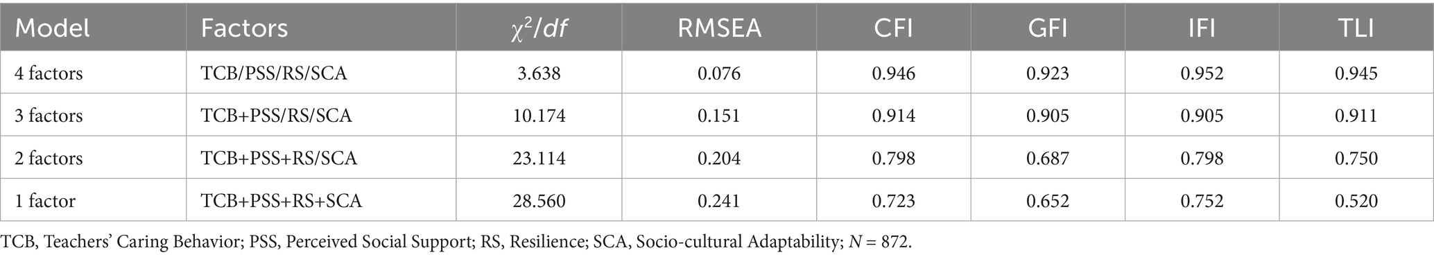 In the Chinese context, factors such as students’ learning styles and psychological states (Li et al., 2023), teacher–student relationships (Liu, 2025), and the buffering role of social support in enhancing well-being (Bethel et al., 2020) have all been shown to influence SCA. According to self-determination theory, individuals are more likely to regulate their behaviors autonomously when motivated by intrinsic values and personal goals (Yang et al., 2023). Furthermore, studies have established that perceived social support (PSS) and resilience (RS) can alleviate stress and improve psychological outcomes, thereby facilitating better adaptation (Tang, 2024; Almukdad, 2024; Tol et al., 2013). Teachers, as primary figures in students’ academic and emotional lives, play a significant role in this process. Teachers’ caring behavior (TCB)—reflected through emotional, instructional, and moral support—has been shown to reduce anxiety and enhance learning outcomes (Hou, 2024; Sutton and Wheatley, 2003). Moreover, educational interactions can foster cross-cultural competence (Shadiev et al., 2021), while strong teacher–student relationships offer critical social support that enhances international students’ SCA (Cifuentes-Faura et al., 2021). However, despite these insights, few studies have examined how teachers’ caring behavior influences socio-cultural adaptability in online contexts using a chain mediation model, especially in Eastern cultural settings (Yu et al., 2019).