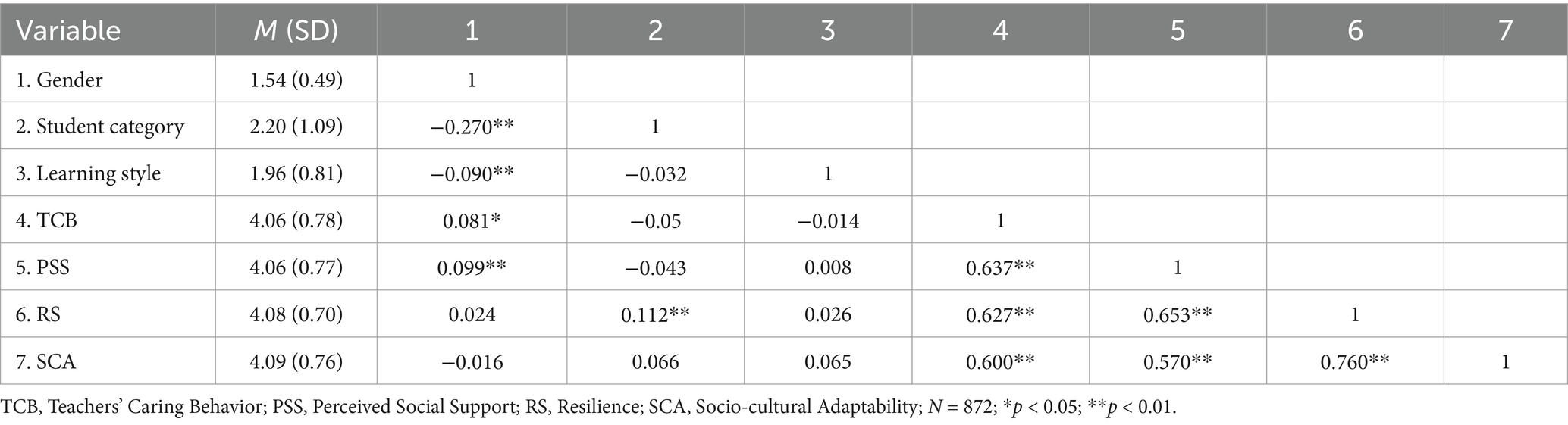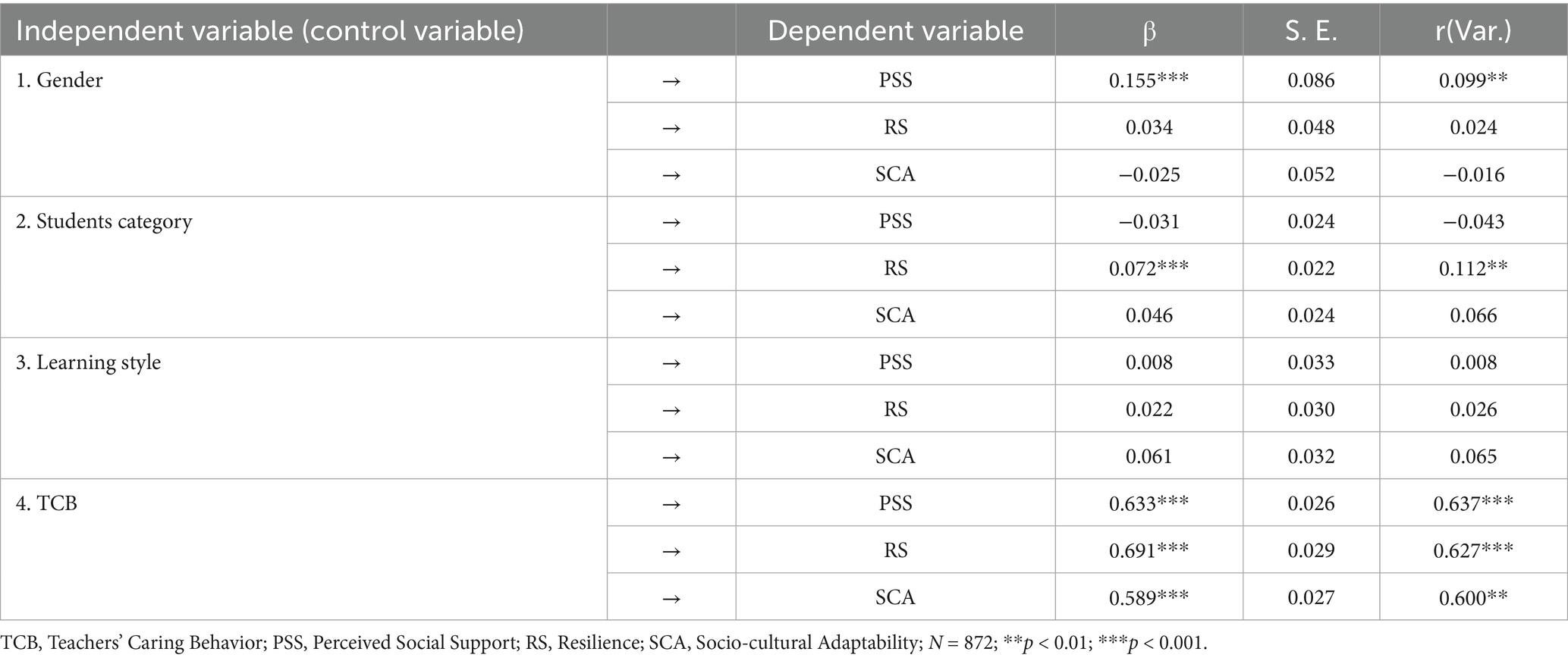 In this study, SPSS27.0 was used to analyze the correlation of various research variables, and the results are shown in Table 3. At first, TCB, PSS, and RS were significantly positively correlated with the SCA of international students. TCB, PSS, and RS were also significantly positively correlated. In the end, there was a significant positive correlation between TCB and PSS. In the demography variable test of international students, it was found that students’ gender, student category, and learning style show various degrees of correlation with the independent and dependent variables, while age, residence, family income, and other factors do not show a correlation, so they are not shown in Table 3. Thus, the gender, student category, and learning style (online or mixed learning) of international students will be listed as control variables in the following research. To facilitate interpretation, Table 2 presents the descriptive statistics and Pearson correlation coefficients among the key variables. The results indicate that teachers’ caring behavior (TCB) is positively correlated with perceived social support (PSS, r = 0.58, p < 0.001), resilience (RS, r = 0.52, p < 0.001), and socio-cultural adaptability (SCA, r = 0.49, p < 0.001). These significant correlations support the hypotheses and lay the foundation for the mediation analysis.
