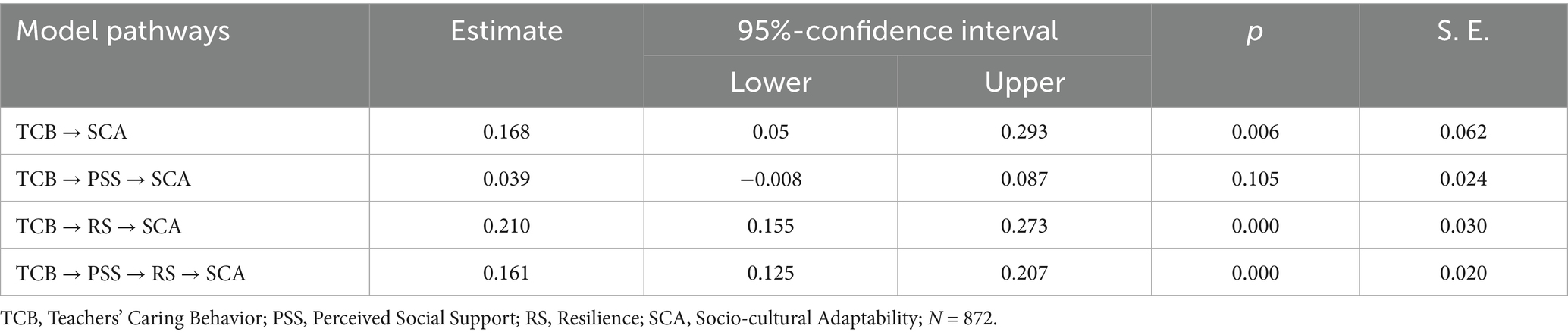 This study utilized a structural equation model to test the mediating effect of PSS and RS on TCB and SCA. The present study used the Bootstrap method of repeated sampling 5,000 times in AMOS to calculate the mediating role of PSS and RS between TCB and SCA. According to the hypothesized model, the values of 4 paths within a 95% confidence interval were calculated to validate H2, H3, and H4. The specific results are shown in Table 5.