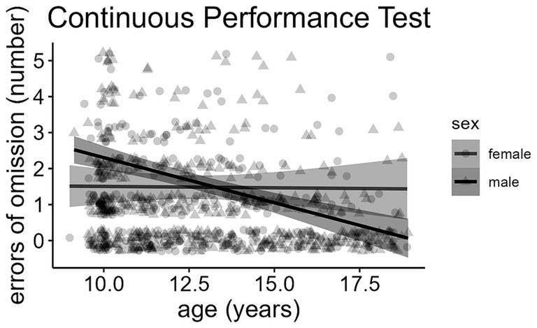 Figure 2. Age-dependent sex differences regarding the number of errors of omission in the Continuous Performance Test.