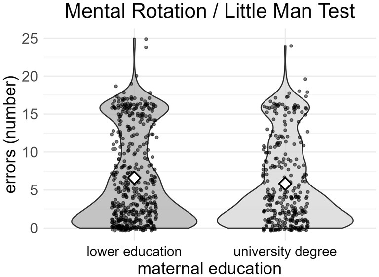 Although the Little Man Test has a shorter duration than the Continuous Performance Test and the total time depends on the child (minimal duration: 19.49 s, maximal duration: 5.80 min, mean: 82.10 s), higher maternal education was associated with better mental rotation abilities, similar to the results of the ABCD study (Assari, 2020). A possible explanation could be that on average children took almost twice as long to complete the Little Man Test compared to the Trail Making Test. Additionally, the Little Man Test might not be as stimulating as the Trail Making Test. Maintaining concentration during the Mental Rotation task might demand greater self-control than the Trail Making Test. Moreover, higher maternal education was linked to increased family income (Maryana et al., 2024). Accordingly, more educated mothers had more financial resources to provide books, musical instruments, special lessons, and the availability of a computer or construction toys to train the children’s visual–spatial abilities (Carneiro et al., 2013). Providing targeted support to train the visual–spatial working memory in kindergarten and school could help mitigate social disparities, as previous studies emphasized its importance for education (Liu et al., 2021), particularly in mathematics, science, technology, and engineering fields (Verdine et al., 2017; Cui and Guo, 2022). When examining the association between maternal education and performance in the Mental Rotation Test in Figure 3, it is conspicuous that a substantial number of participants made exactly 16 errors. These 73 participants did not appear to apply any mental rotation strategy and consistently selected the side of the screen where the bag was located, regardless of the stimulus orientation.