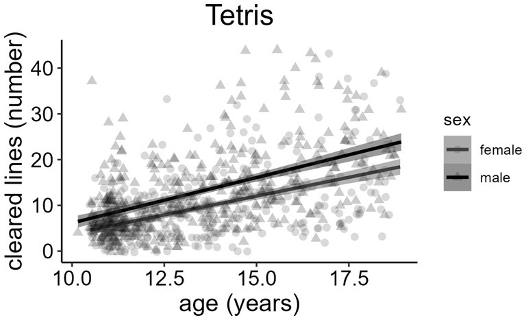 R version 4.3.1 was used for all statistical computations and visualizations. We used multiple linear regression models, incorporating the number of errors of omission/commission and mean reaction time for a correct click for the Continuous Performance Test, the sum of errors and required time for the Mental Rotation Test, the number of completed lines and mean rotation/movement faults in Tetris, and the total time for the Trail Making Test as dependent variables. Sex and highest maternal education were included as categorical independent variables. All models were adjusted for age as a continuous numeric variable, while the Tetris models were further adjusted for the Tetris experience. Interactions between age, sex, and maternal education were investigated but only reported if they were statistically significant (p < 0.05). Since boys were expected to develop later and girls to peak earlier, we initially used a polynomial model with respect to age concerning the Trail Making Test. However, the parameters for the 2nd and 3rd degrees were insignificant, so we opted for a linear model at this point. To generate a composite score from the three standard tests and compare it with Tetris, we calculated z-scores for all four tests, adjusted for age, sex, and, in the case of Tetris, for Tetris experience, using the gamlss package (Rigby and Stasinopoulos, 2005). The Box-Cox-Cole-Green (BCCG) distribution was applied to model the Trail Making Test, and Zero Inflated Poisson (ZIP) to model cleared lines in Tetris and errors in the Mental Rotation and Continuous Performance Test. Strengths of associations were indicated by non-standardized regression coefficients (ß). The significance level was α = 0.05. Plots, created with ggplot, included grey shadows to show the 95%-confidence interval (95% CI). An ordinal regression analysis examined the associations between Tetris experience (dependent variable), sex, and maternal education. These results were reported as odds ratios (OR).
