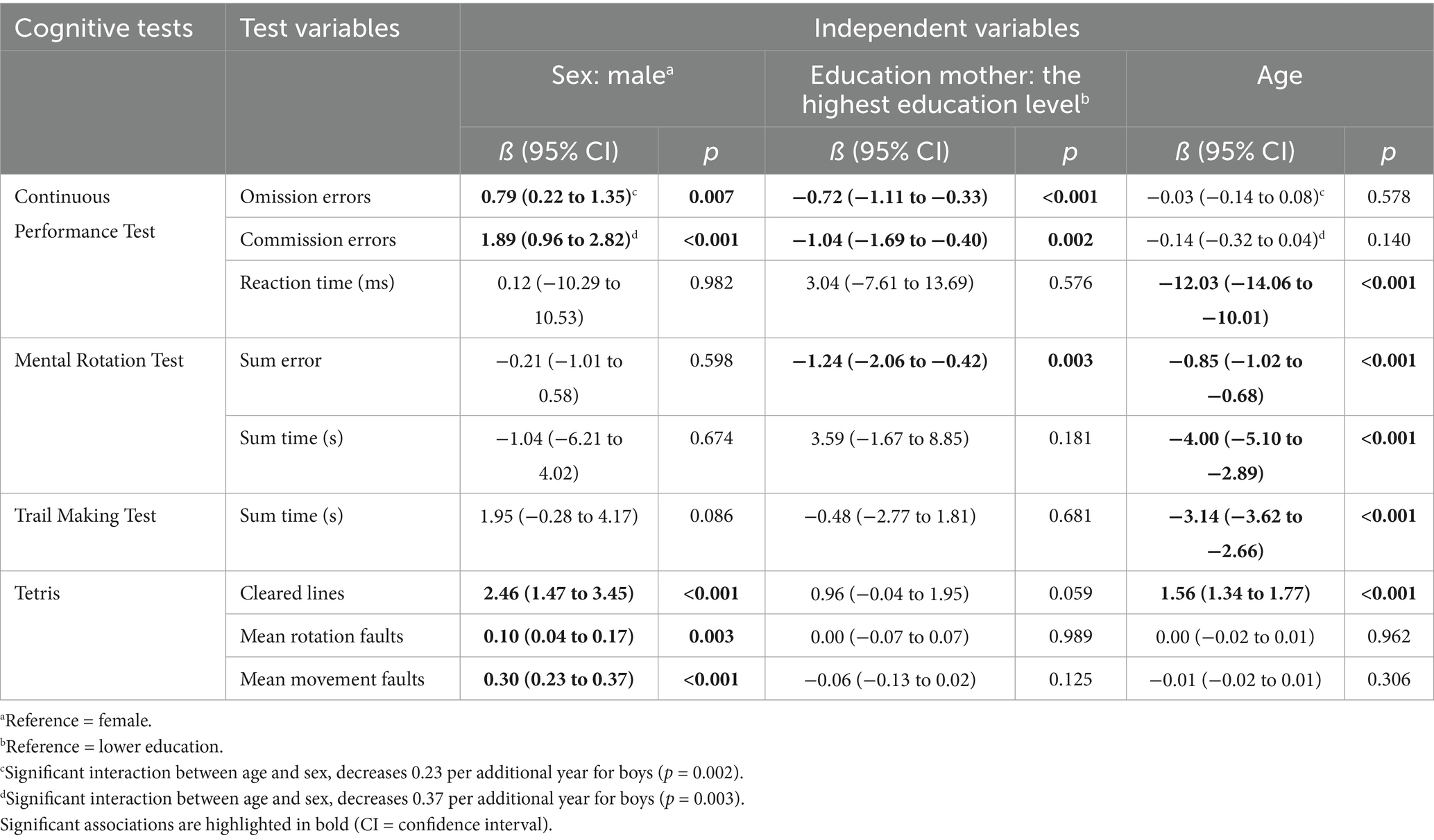 Methods: Cognitive performance was examined in 9- to 19-year-olds using four tests (Trail Making Test, Mental Rotation Test, Continuous Performance Test, Tetris). Data were collected between October 2019 and December 2023 as part of the LIFE Child study, conducted in Leipzig (Germany), involving 770 participants for Tetris, Trail Making, and Mental Rotation, and 888 participants for the Continuous Performance Test. Multiple regression models, adjusted for age, considered sex and maternal education as independent variables.