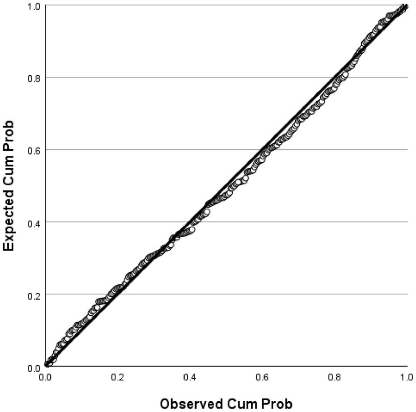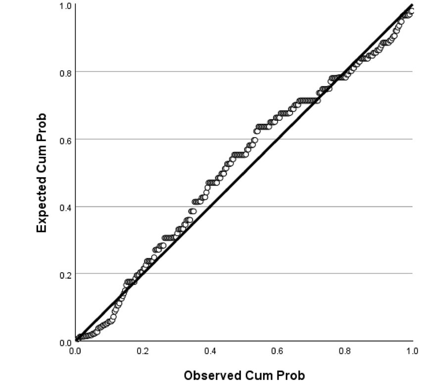 Table 7 presents the results of the analysis on the influence of trust in golf instructors on customer satisfaction. The model demonstrates an explanatory power of 3.1%, which is statistically significant. The F-value was 9.285, with a significance level of 0.003, indicating that the regression model was appropriate. The t-value was 3.047 and the significance level was 0.003, supporting this hypothesis. Detailed statistical results were reported in Table 7. The fundamental assumptions of regression analysis were evaluated. Normality of residuals was supported by the Kolmogorov–Smirnov test (p = 0.040) and Shapiro–Wilk test (p = 0.001), as well as by visual inspection of the histogram and normal Q-Q and P–P plots, which indicated distributions consistent with normality (Figures 7, 8). Homoscedasticity was confirmed by the residual scatterplot, which showed a random distribution of residuals around zero without identifiable patterns (Figure 9). The Durbin–Watson statistic was 1.747, close to the ideal value of 2, suggesting no autocorrelation. Collectively, these results indicate that the regression model satisfied the assumptions of normality, homoscedasticity, and independence.