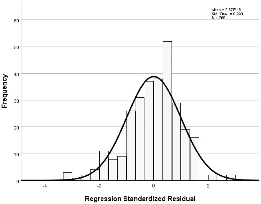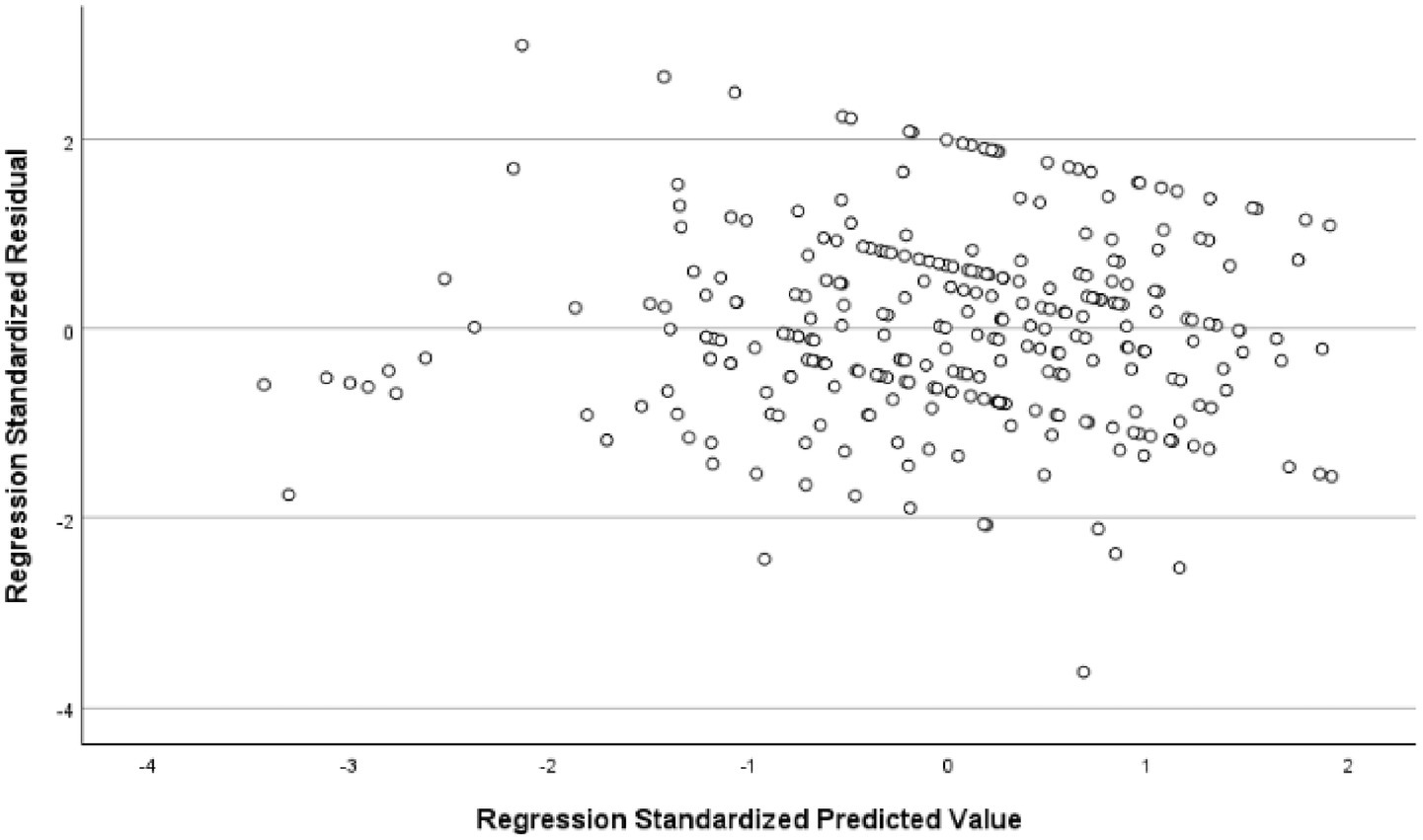 The analysis revealed that the model had an explanatory power of 18%, with an F-value of 16.029 and a significance level of 0.001, indicating that it was statistically significant. Among the components of instructor image, expertise, competency, and role were found to significantly affect trust in instructors. In contrast, the attitude component showed a t-value of 0.283, which was below the threshold value of 1.96, and a significance level greater than 0.005, indicating that attitude did not have a significant influence on trust in the instructor. All other variables had acceptable t-values and significance levels, and the tolerance values were above 0.1, indicating no multicollinearity. Detailed statistical results were reported in Table 6. The fundamental assumptions of regression analysis were assessed. Normality of residuals was supported, as the standardized residuals in the P–P plot closely followed the diagonal line (Figure 1), and the histogram indicated a mean near zero and a standard deviation close to one (Figure 2). Homoscedasticity was confirmed by the residual scatterplot, which showed a random distribution of residuals around zero without discernible patterns (Figure 3). The Durbin–Watson statistic was 1.854, close to the ideal value of 2, suggesting no autocorrelation. Collectively, these results indicate that the regression model satisfied the assumptions of normality, homoscedasticity, and independence.