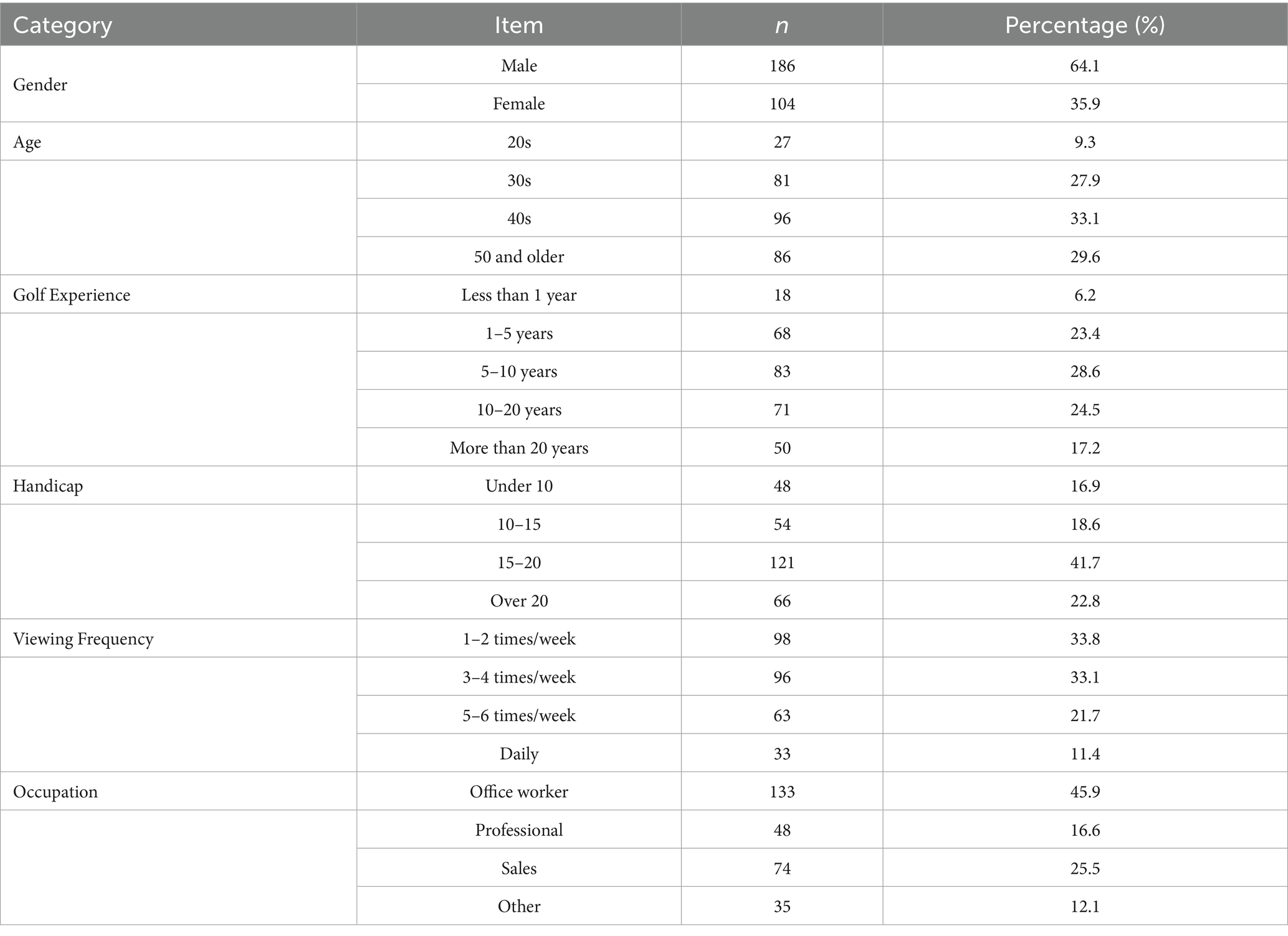 The participants of this study consisted of 300 Korean adult amateur golfers. Data were collected via an online survey conducted between January 7 and March 24, 2025. The participants were recruited using convenience sampling. This study was conducted in accordance with the Declaration of Helsinki. The need for ethical review and approval was waived for this study according to Article 13 of the Enforcement Rule of the Bioethics and Safety Act of the Republic of Korea. To ensure voluntary participation, the following statement was clearly included on the first page of all questionnaires: “Your participation in this study is completely voluntary. There are no foreseeable risks associated with this study. However, if you feel uncomfortable answering any questions, you may withdraw from the survey at any point.” After excluding 10 insincere responses, 290 were included in the final analysis. The demographic characteristics of the participants are presented in Table 1.