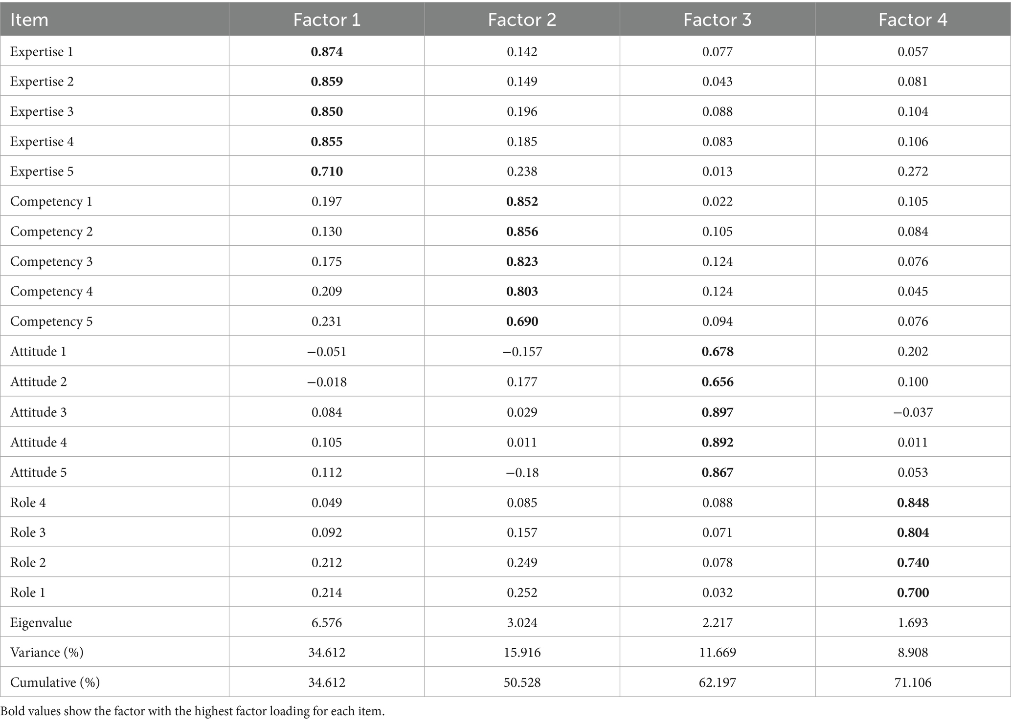 An exploratory factor analysis (EFA) was conducted to verify the construct validity of the measurement instruments. Factors were extracted by selecting items with eigenvalues greater than 1.0, and items with factor loadings above 0.4 were retained using a repeated estimation of covariance and orthogonal rotation.