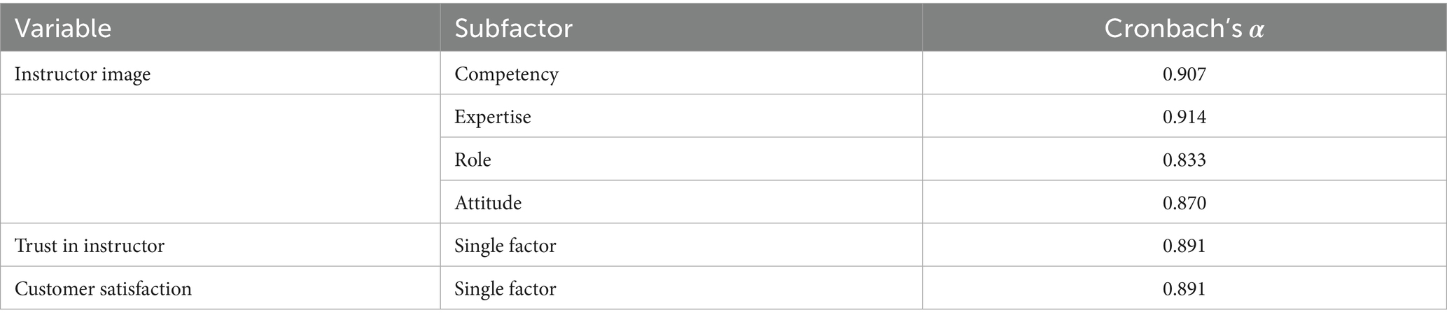If the Cronbach’s α value of a survey instrument is above 0.6, it is generally considered reliable. In this study, the reliability of the questionnaire was found to be high. Specifically, Cronbach’s α values for the instructor image ranged from 0.833 to 0.914, while the values for trust in the instructor and customer satisfaction were both 0.891.