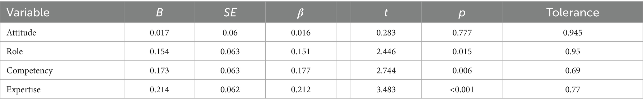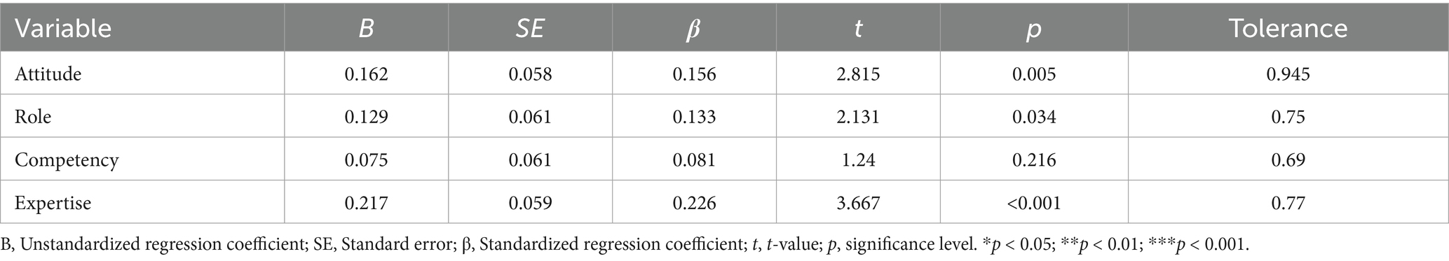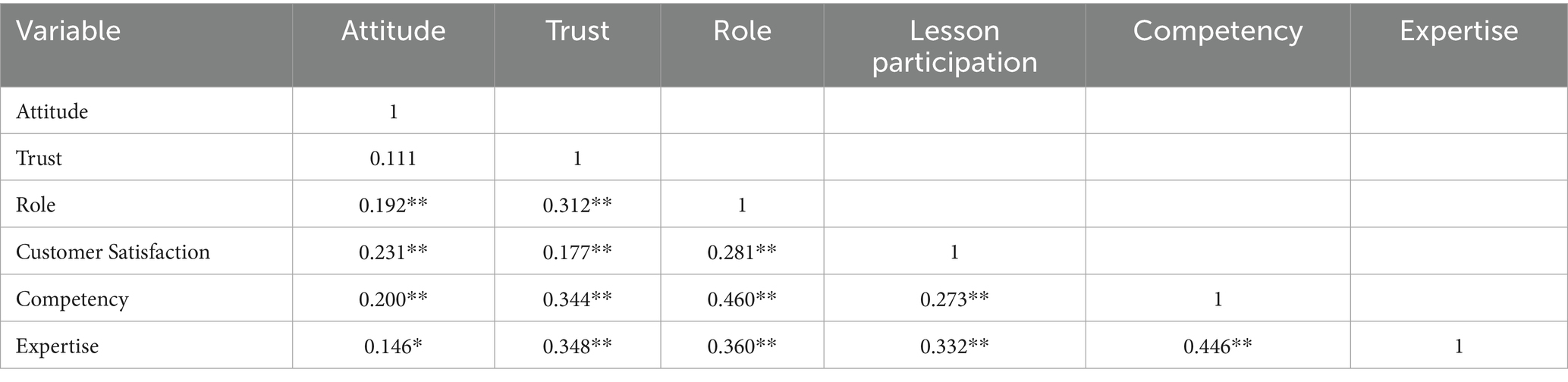 As shown in Table 5, the correlation analysis revealed a positive relationship between instructor image, trust, and lesson participation. Among these relationships, the correlation between competency and role was the most significant, with a coefficient of 0.460. The second most significant correlation was between competency and expertise. The correlation coefficients ranged from 0.111 to 0.460, which were smaller than the multicollinearity threshold of 0.80, indicating no multicollinearity issues.