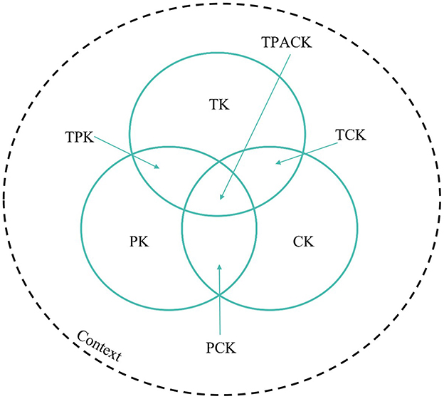 The Technological Pedagogical and Content Knowledge (TPACK) framework (see Figure 1; Koehler et al., 2017) posits that teachers need to master three primary domains of knowledge—technological, pedagogical, and content-specific—to integrate digital tools into their teaching effectively (Huwer et al., 2019). TPACK thus serves as a valuable model for diagnosing and developing teachers' ability for digital integration in complex classroom settings.