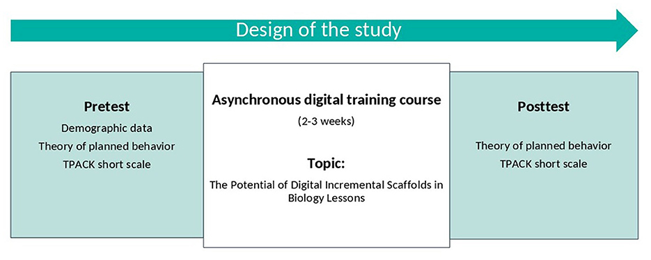 The present study employed a single-group quasi-experimental pre-post design without a control group. This choice was motivated by the institutional context: the training was offered as a regular course unit, that all enrolled students participated and no separate control group could be established. As the training was part of the curriculum, withholding it from a subgroup would have raised organizational and ethical concerns. The design thus allowed us to evaluate the feasibility and short-term effects of the training under realistic teaching conditions, while acknowledging its methodological limitations. The sample comprised pre-service biology teachers participating in a university didactic training course on the integration of digital incremental scaffolds in biology lessons. The data were collected at two measurement points (T1 = before the training; T2 = after completion of the training). In a final sample of N = 100, the participants took part in the pretest, posttest, and intervention (see Figure 3). Additional demographic data was collected as part of the pretest in a previous course unit. In the intervention, the participants completed a digital training course on the topic of “The potential of digital incremental scaffolds in biology education” within 2–3 weeks. The posttest was integrated into the final training module. Both surveys were conducted using the online survey platform LimeSurvey (completion time: M = 9.70 min, SD = 4.10).