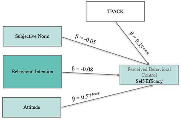 Results: There were significant increases across all sub-dimensions of the TPB, with the highest effective sizes in attitude (d = 0.86) and self-efficacy (d = 1.33); as well as behavioral intention itself (d = 0.80) and TPACK (d = 0.70). A regression analysis showed that attitude (β = 0.66, p < 0.001) and subjective norm (β = 0.18, p < 0.01) significantly predicted behavioral intention, while TPACK (β = 0.35, p < 0.001) and attitude (β = 0.57, p < 0.001) significantly predicted self-efficacy.