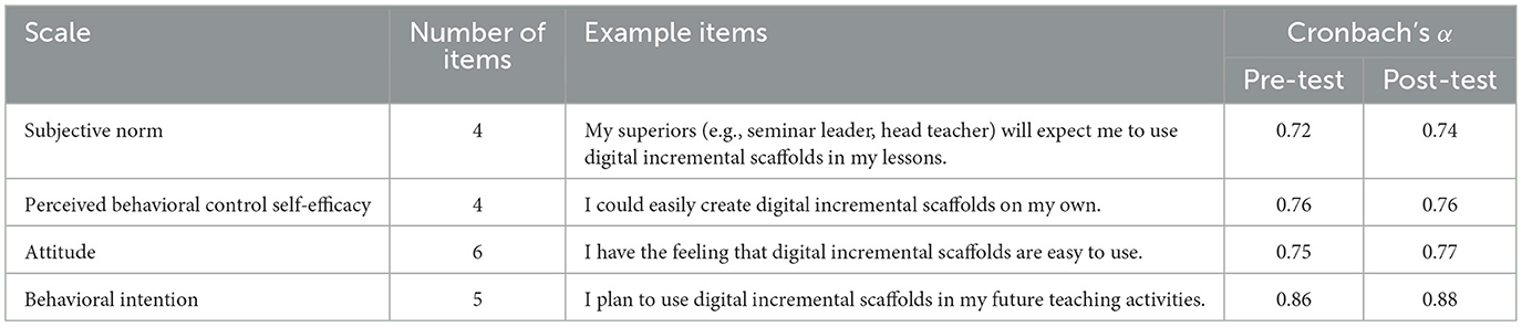 To examine pre-service biology teachers' behavioral dispositions toward the implementation of digital incremental scaffolds, an adapted questionnaire was developed based on several published Theory of Planned Behavior (TPB) scales Aptyka and Großschedl, (2022); Francis et al., (2004); Leiss et al., (2025); Sadaf et al., (2012). The adapted questionnaire has been tested and validated in the context of gamification in biology education by Leiss et al. (2025). We measured four out of the five standard TPB constructs: attitude, subjective norm, perceived behavioral control self-efficacy, and behavioral intention. The construct perceived behavioral control controllability was excluded due to the fixed framework conditions for the participants. All items were adapted to specifically address the use of digital incremental scaffolds in (future) biology lessons.