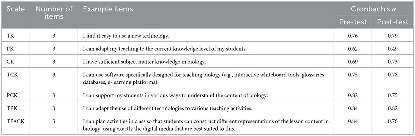 A short instrument developed by Brändle et al. (in preparation), (in revision) based on (Zinn et al. 2022) was employed to assess participants' perceived technological pedagogical content knowledge (TPACK). The scale consisted of three items per subscale, also rated on a five-point scale with the same response format. All TPACK subscales exhibited acceptable to good reliability (see Table 2). The TPACK scale has been tested and validated by Brändle et al. (in preparation), though item-formulation has been adapted to fit biology education.