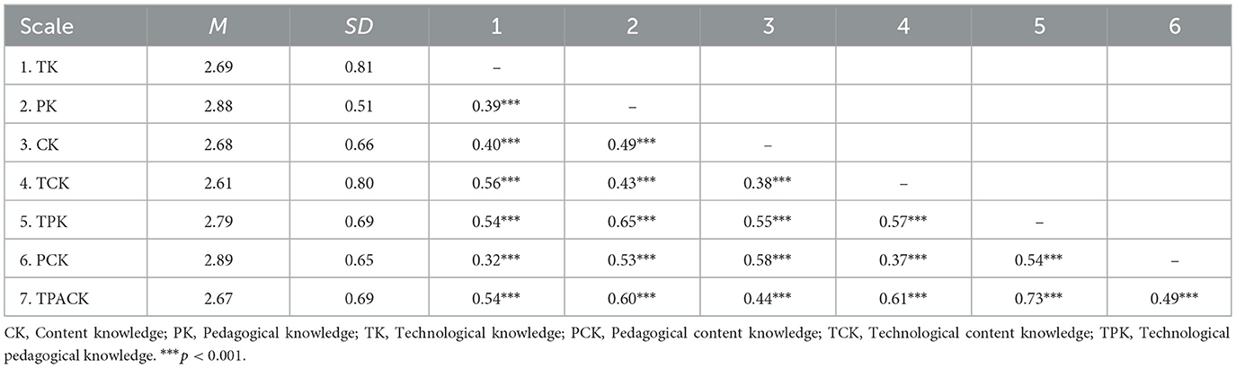Given the high correlations between the individual subscales of the TPACK framework (see Table 2), the construct was treated as a unidimensional measure in subsequent analyses. For example, the technological pedagogical knowledge scale (TPK) showed strong correlations with both pedagogical knowledge (PK; r = 0.65, p < 0.001) and the overall TPACK score (r = 0.76, p < 0.001). Similarly, there were significant correlations between TPACK and all other sub-dimensions, including technological knowledge (TK; r = 0.55, p < 0.001), content knowledge (CK; r = 0.52, p < 0.001), and pedagogical content knowledge (PCK; r = 0.44, p < 0.001). These results indicated a high degree of convergence among the sub-dimensions, suggesting that they collectively reflect a coherent underlying construct.