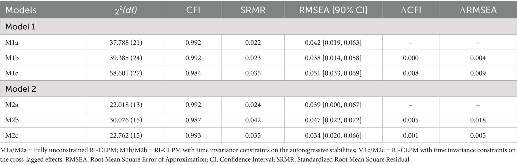As shown in Table 3, the constrained RI-CLPM (with equality constraints on autoregressive and cross-lagged paths) demonstrated comparable fit to the unconstrained model, with no significant decrement in model performance. Considering interpretability, Models M1a and M2a were selected as the final models.