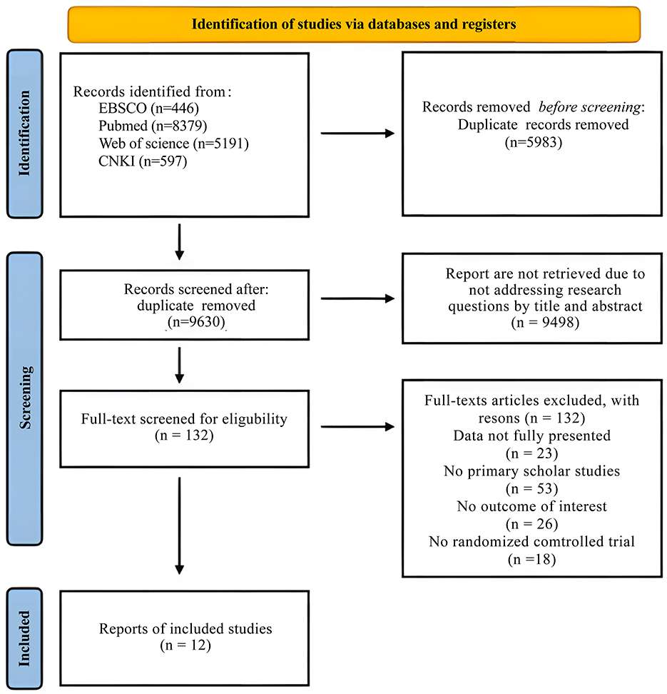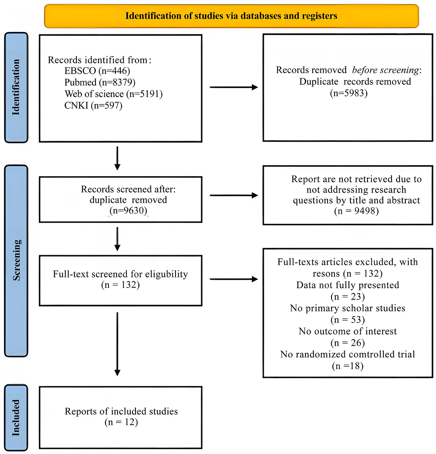 A total of 15,486 articles were initially identified: 5,191 from Web of Science, 8,376 from PubMed, 1,293 from EBSCO, and 626 from CNKI (China National Knowledge Infrastructure). After importing these articles into EndNote software and removing duplicates, 9,503 articles remained. During title screening and abstract review, 9,371 articles were excluded as they did not meet the requirements, leaving 132 articles. Subsequent full-text review excluded 120 articles that did not meet the criteria related to outcome measures, data completeness, or participant characteristics. Ultimately, 12 studies were included, comprising 1 master's thesis and 11 journal articles. A detailed flowchart of the screening process is shown in Figure 1.