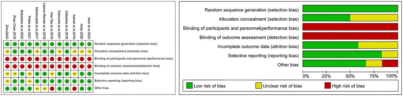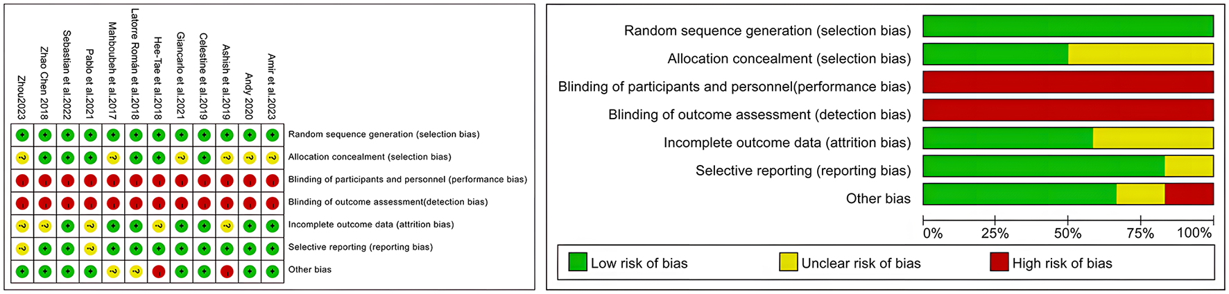 Study quality was assessed using the Cochrane Risk of Bias tool, evaluating the following domains: random sequence generation, allocation concealment, blinding of participants and personnel, blinding of outcome assessment, incomplete outcome data, selective outcome reporting, and other sources of bias. As recommended, each criterion was rated as follows: “Low risk” if the study fully met quality standards with minimal bias; “Unclear risk” if bias concerns potentially affected result credibility; and “High risk” if bias seriously undermined result credibility. Disagreements between reviewers were resolved through consultation with other team members to reach a consensus-based judgment.Among the 12 RCT and cRCT included in the analysis, all studies adequately reported the random sequence generation and experimental group allocation procedures. However, methodological limitations existed in the operational details of allocation concealment. Due to the dual constraints of ensuring participant informed consent and the necessity for real-time medical supervision during exercise interventions, these studies faced inherent obstacles to implementing strict blinding during the trial phase.Based on the Cochrane Risk of Bias assessment, all studies were rated as “High risk” for selection bias. See Figure 2.