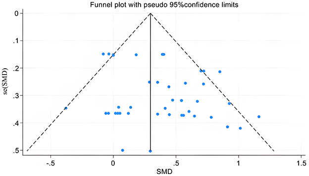Funnel plot with pseudo ninety-five percent confidence limits, showing data points scattered around a vertical line representing the standard mean difference (SMD). The vertical line is centered with diagonal lines forming a triangular section, indicating the range of variability. Points are widely distributed, suggesting variability in the data.