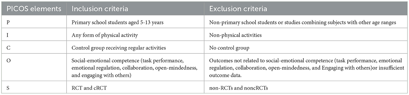 Currently, Physical activity (PA) is receiving widespread attention in the fields of education and mental health as a significant intervention for enhancing SEC. A substantial body of empirical research indicates that PA not only offers significant physiological benefits, but also provides children with practical settings for collaborative interaction, understanding of rules, emotional regulation, conflict resolution, and goal setting–key components of SEC (Ahn and Fedewa, 2011; Dale et al., 2019). Specifically, diverse forms of PA such as Judo (Ludyga et al., 2022), Taekwondo (Roh et al., 2018), physical games (Luna et al., 2021; Zhou, 2023), dance (Bollimbala et al., 2019), aerobic exercise (Tse, 2020; Williams et al., 2019), physical training (Haghighi et al., 2023), and structured physical activity (Condello et al., 2021; Ángel Latorre-Román et al., 2021; Najafabadi et al., 2018; Zhao and Chen, 2018a) have been shown to positively impact multiple dimensions of SEC in primary school students. However, existing studies exhibit significant heterogeneity in participant demographics (e.g., age, gender, cultural background), intervention parameters (e.g., activity type, frequency, duration), and the dimensions of SEC measured. This heterogeneity has led to considerable variation in research findings, making it difficult to draw definitive conclusions regarding the overall effectiveness of PA interventions or the differential impacts of various PA types and implementation parameters. Based on this, the present study aims to systematically integrate and quantitatively assess relevant research involving primary school students aged 5–13 years using meta-analytic methods, seeking to clarify the overall intervention effect of PA on SEC and elucidate its specific impacts on the core sub-domains of SEC (namely task performance, emotional regulation, collaboration, open-mindedness, and engaging with others). Concurrently, this study will explore potential moderating factors, including intervention duration, sample characteristics, and type of PA, striving to uncover the key mechanisms influencing intervention effectiveness. Through the above analyses, this study aims to provide systematic and robust empirical evidence for PA intervention programs targeting primary school students, thereby promoting the optimization of SEC cultivation practices and policy improvements, ultimately fostering the holistic development and wellbeing of children.