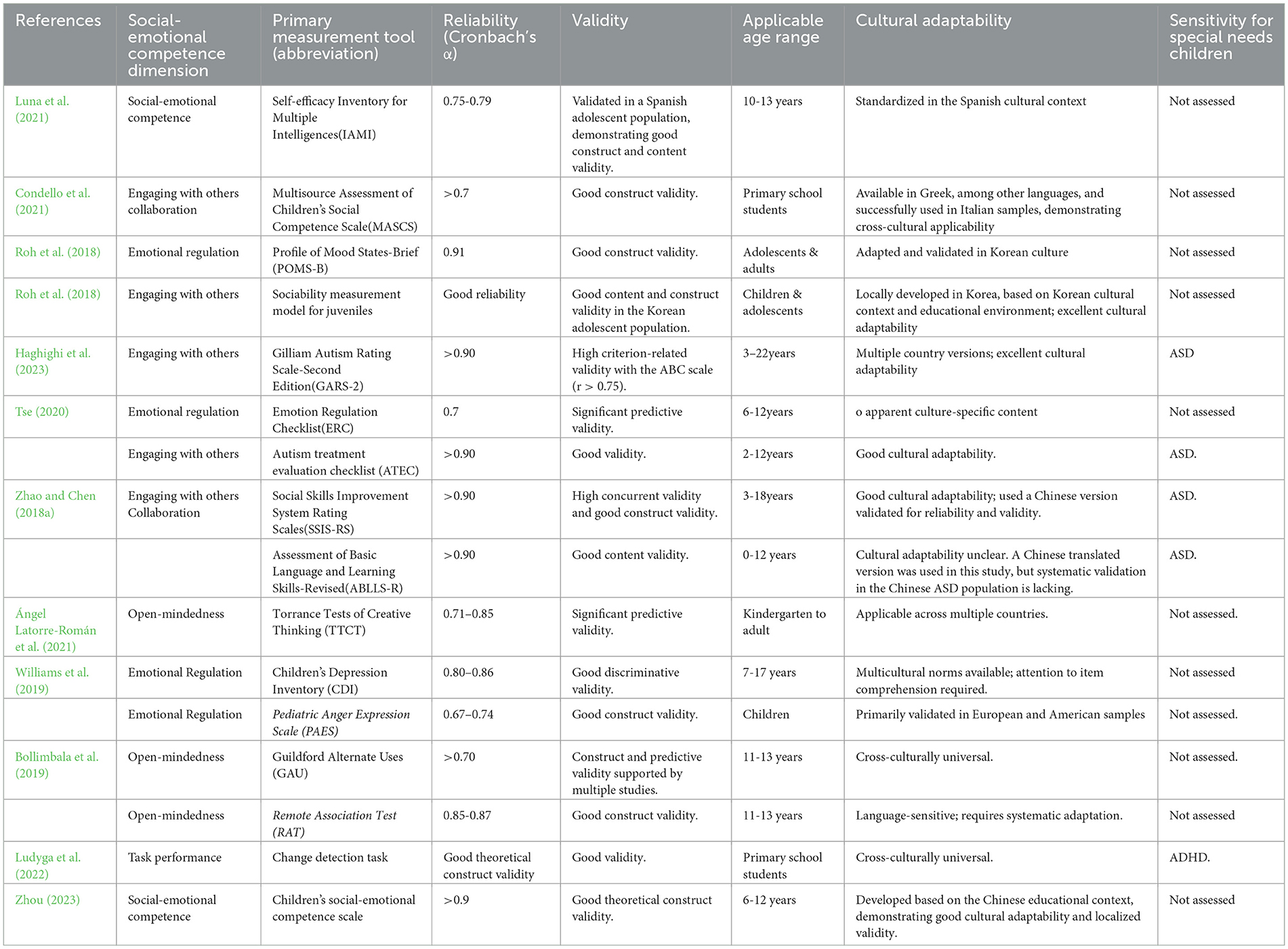 The included studies employed diverse assessment tools for measuring SEC. To systematically evaluate their psychometric properties, a “Measurement Tool Characteristics Table” was constructed (see Table 2), covering each tool's reliability (Cronbach's α), validity evidence, applicable age range, cultural adaptability, and sensitivity for special needs children (such as Autism Spectrum Disorder and Attention-Deficit Hyperactivity Disorder). The summary indicates that most tools demonstrated good internal consistency (Cronbach's α > 0.70) and construct validity. However, some tools showed limitations in their applicability for special needs children and insufficient cross-cultural adaptability.