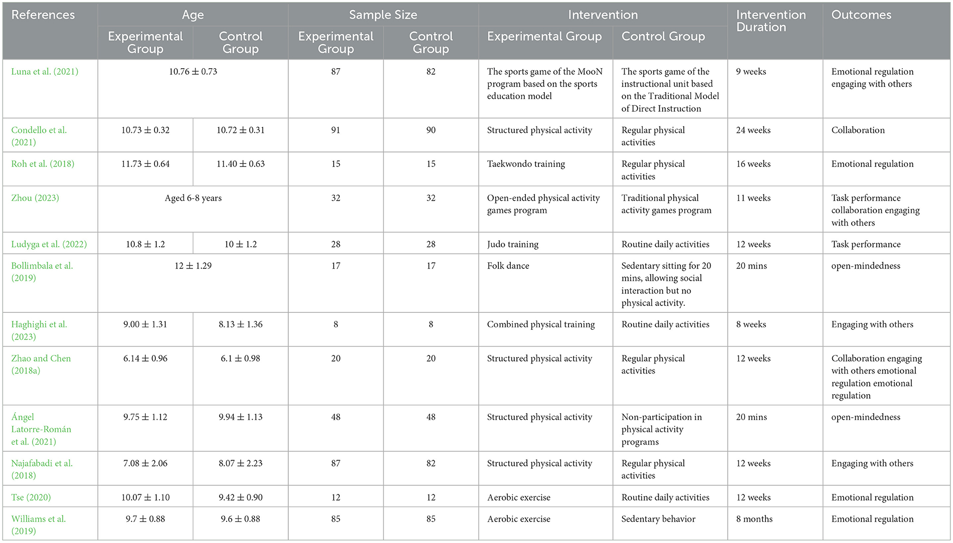 This meta-analysis included 12 studies with participants comprising primary school students aged 5 to 13 years. The primary objective was to quantitatively synthesize the effectiveness of PA interventions on the SEC of primary school students and systematically evaluate the intervention effects across the various dimensions of SEC. This was achieved by synthesizing diverse PA intervention programs targeting different populations from the literature, while also exploring the influence of three potential moderator variables: type of PA, participants, length of intervention, and research period.
