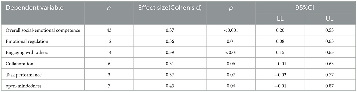 The results of this study indicate that the pooled effect size for all PA interventions aimed at developing SEC in primary school students was statistically significant. The overall effect size for SEC pre- to post-intervention ranged from small to medium, suggesting the potential practical value of such interventions. This finding aligns with previous research. For instance, Wright et al. found that PA contributes to the promotion of SEC characterized by respect, participation, engagement, and cooperation (Wright et al., 2021). Based on the Comprehensive School Physical Activity Program (CSPAP) framework, Moon et al. conducted a meta-analysis of 27 studies and found a small-to-medium positive effect (Hedges' g = 0.44) of PA interventions on the SEC of primary school students (Moon et al., 2024). Another systematic review of meta-analyses also indicated that well-designed and well-implemented Social and Emotional Learning programs are associated with positive social, emotional, behavioral, and academic outcomes in children and adolescents, demonstrating a medium effect size (Jones and Bouffard, 2012).