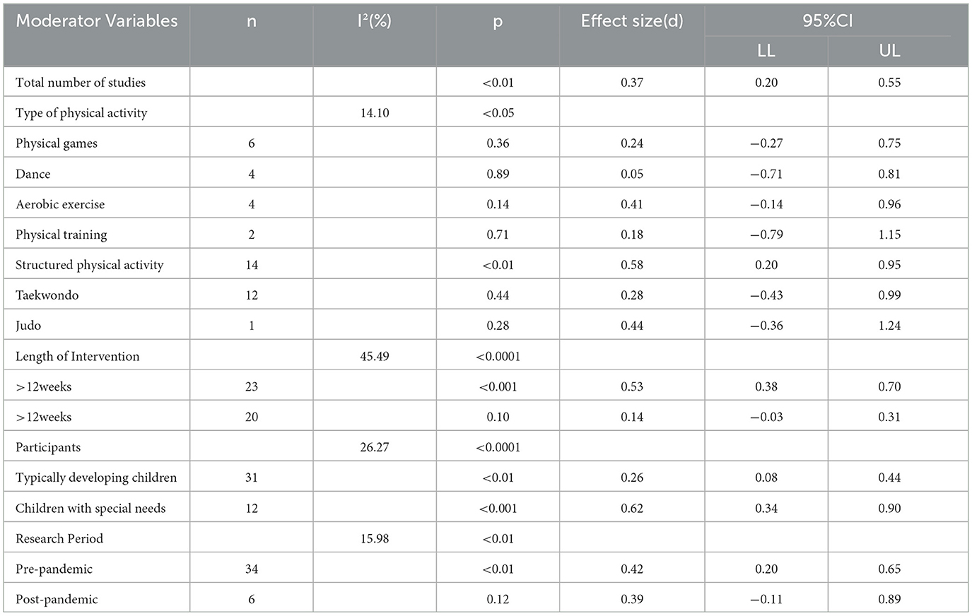Results: Twelve studies were included in this meta-analysis. The results indicated that PA intervention improved SEC in primary school students [d = 0.37, 95% CI (0.20, 0.55), p < 0.001]. Moderator analysis revealed that structured PA and shorter-length interventions ( ≤ 12 weeks) yielded superior effects on SEC. Furthermore, the effect size was significantly higher for special needs children [children with Autism Spectrum Disorder (ASD) and Attention-deficit hyperactivity disorder (ADHD)] compared to typically developing children. Pre-pandemic physical activity interventions demonstrated significantly more positive effects on SEC than those implemented post-pandemic.