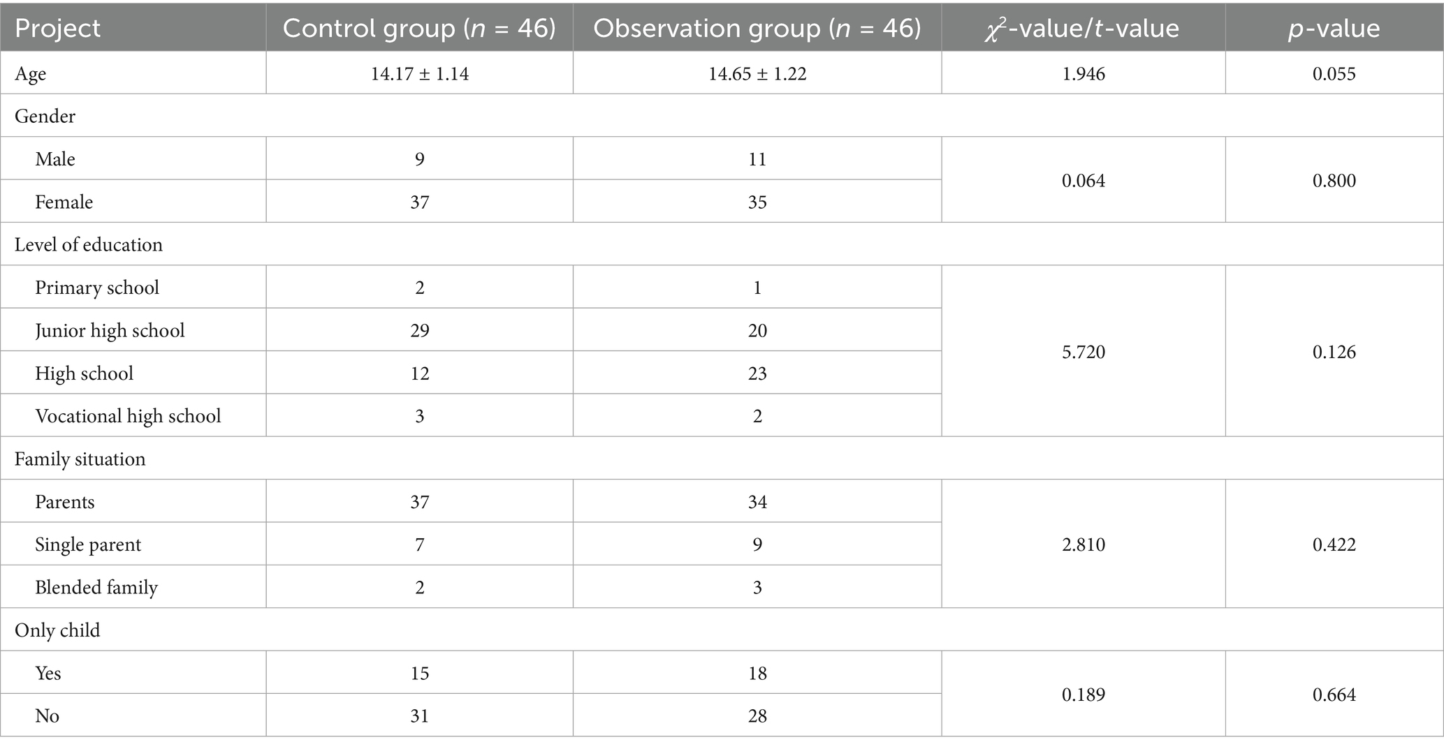 A total of 92 patients with depression who visited this mental health center from May 2022 to December 2024 were selected as the study subjects. They were divided into an observation group (46 cases) and a control group (46 cases) using a randomized controlled grouping method. The experimental group ranged in age from 12 to 16 years, with an average age of (14.65 ± 1.22) years. The control group also ranged in age from 12 to 16 years, with an average age of (14.17 ± 1.14) years (Table 1). This study was reviewed and approved by the Ethics Committee of a municipal mental health center, and permission was granted to conduct this research.