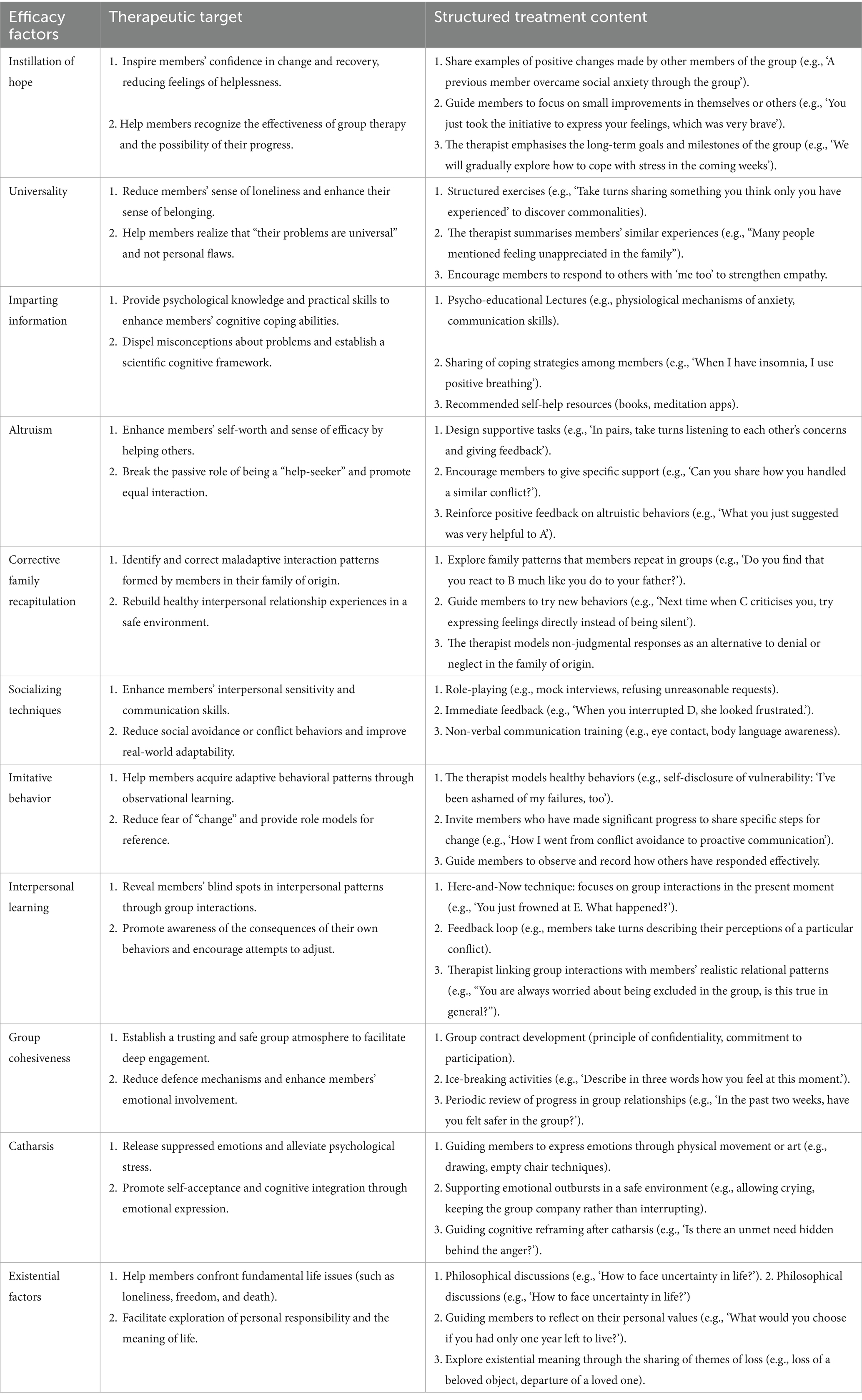 Group psychotherapy is a highly effective psychological treatment method, offering many advantages that individual psychotherapy does not provide. Additionally, group psychotherapy can accommodate more patients and generate significant economic benefits (Beck and Coffey, 2005). By integrating the 11 therapeutic factors proposed by Irvin D. Yalom and systematically organizing the goals and content of these factors (Table 2), therapists can design intervention strategies in a more structured manner, thereby enhancing the effectiveness of group therapy.
